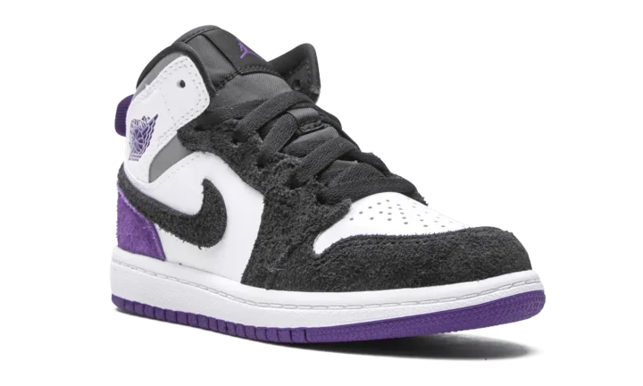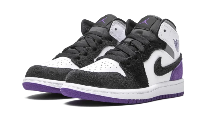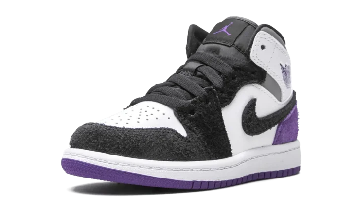 The Air Jordan 1 Mid SE PS "Purple Suede" is the preschool sizing of Michael Jordan's first signature shoe in a colorway that combines different materials and colors to tell its story. The "Purple Suede" makeup of the alternate mid-top Jordan 1 sports a regal hue of purple suede paneling on the heel that contrasts the smooth white leather found on the collar, mid-panel, and toe. The same hairy suede fabric can be found on the Swoosh detailing on either side and on the forefoot, toe cap, and eyelets. Jordan Brand places a purple "Wings" emblem on the collar and purple Jumpman branding on the tongue tag of the black nylon tongue.