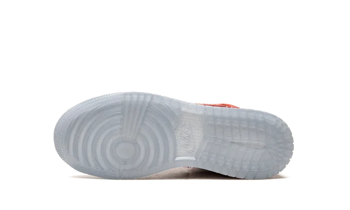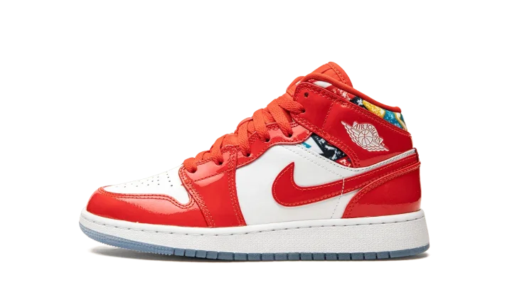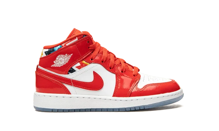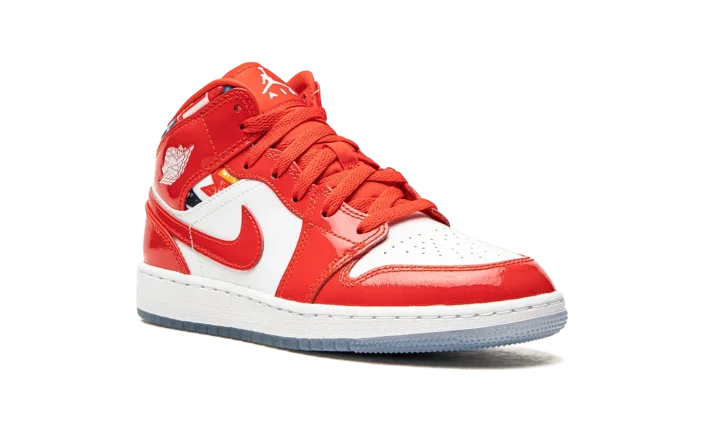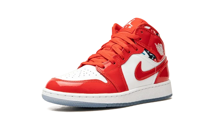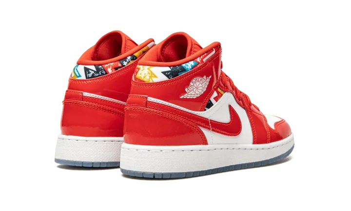 The Air Jordan 1 Mid SE GS "Barcelona Sweater" is a colorway of Michael Jordan's first signature shoe in youth sizing that draws inspiration from a sweater that Jordan wore at the '92 Summer Olympics in Barcelona. The flashy "Barcelona Sweater" features a two-tone, white-and-Chile Red upper with white leather on the perforated toe and mid-panel. The overlays and Swoosh appear in glossy Chile Red leather. White "Wings" branding is located on the collar and a white Jumpman and "Air" detailing appear on the red nylon tongue tag. The collar features a "Barcelona" inspired motif similar to the abstract tribal pattern found on the apparel that Jordan wore at the 1992 Olympics.