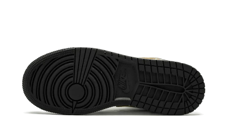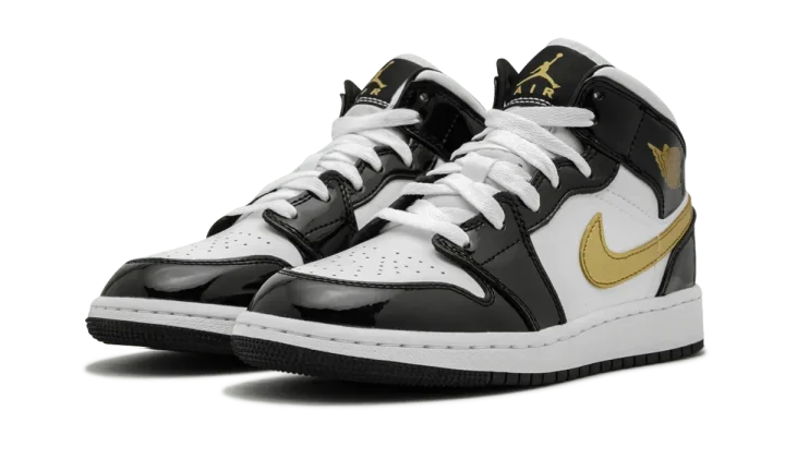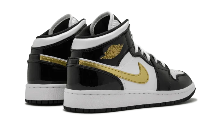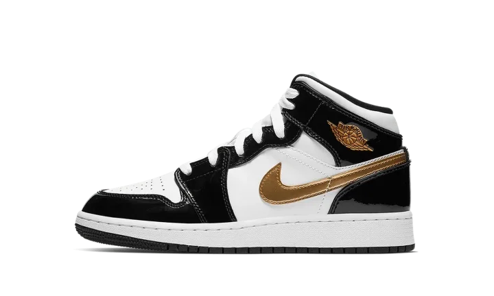 The grade school release of the Air Jordan 1 Mid is outfitted in a clean white, black, and gold color scheme. A white leather upper is given premium accents like black patent leather overlays, and a glossy gold Swoosh. Shiny gold hits also accentuate the Jumpman logo on each tongue and the Wings logo on each ankle.