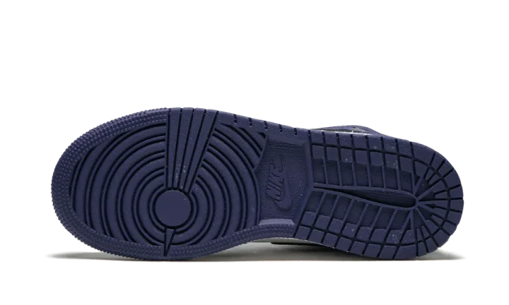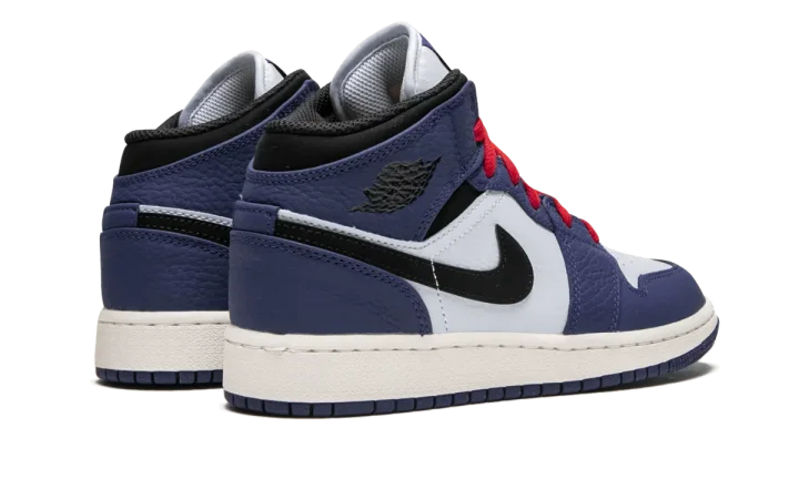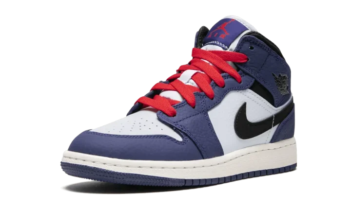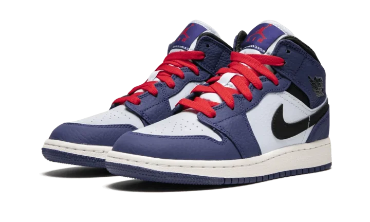 The Air Jordan 1 Mid is a mid-top version for kids of the massively popular Air Jordan 1. This colorway released in grade school sizing and features a white leather upper with Deep Royal blue overlays. Black leather is used on the Swoosh and ankle collar. Red laces and a matching Jumpman logo on the tongue give the pair a bright burst of color.