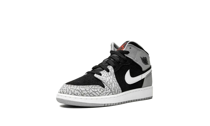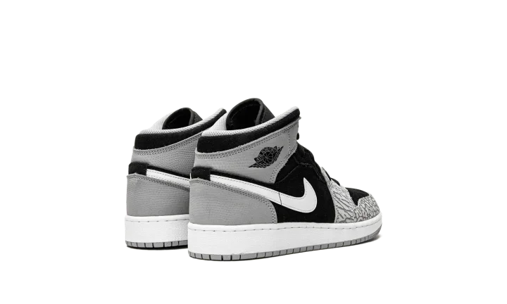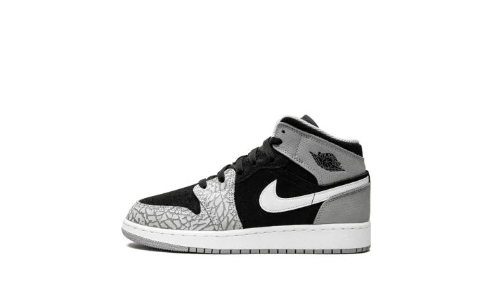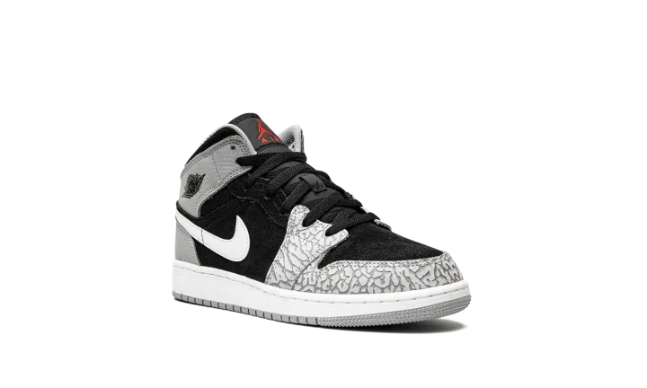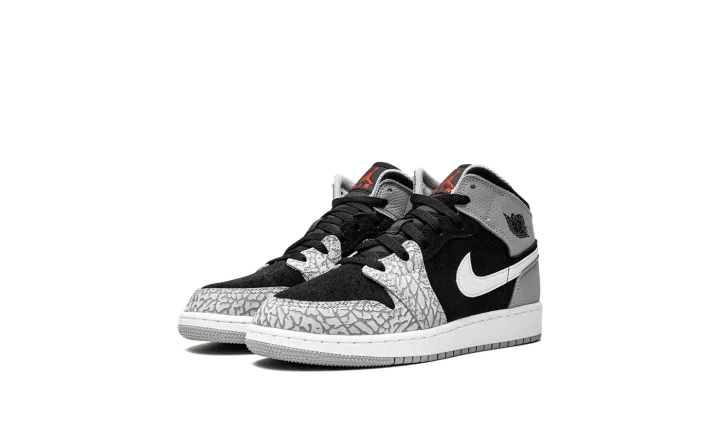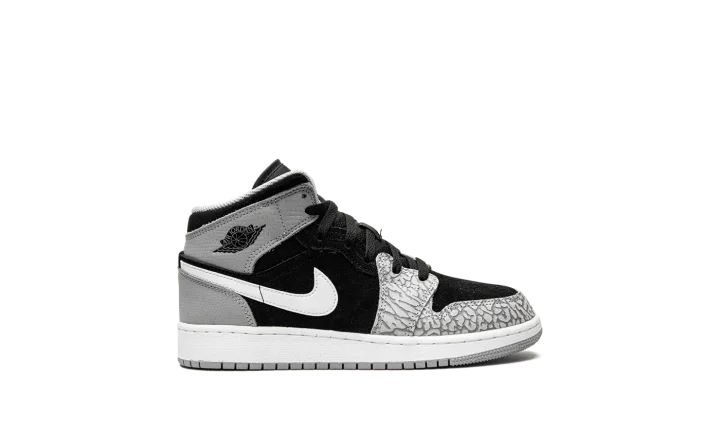 The Air Jordan 1 Mid GS "Elephant Toe" is the youth sizing of the retro basketball shoe in a colorway that features the same iconic patterning found on the Air Jordan 3. Originally released in 1988, the Jordan 3 was the first-ever basketball shoe to feature elephant-inspired detailing on its design when it was introduced with the animal-esque patterning on its toe cap and heel. Here, the "Elephant Toe" uses the same print as the Jordan 3 to great success. The material in question is found on the toe cap and forefoot. Contrasting black suede appears on the perforated toe and mid-panel. Textured grey leather is located on the collar and on the heel. A white leather Swoosh appears on the sides and a black "Wings" logo resides on the collar.