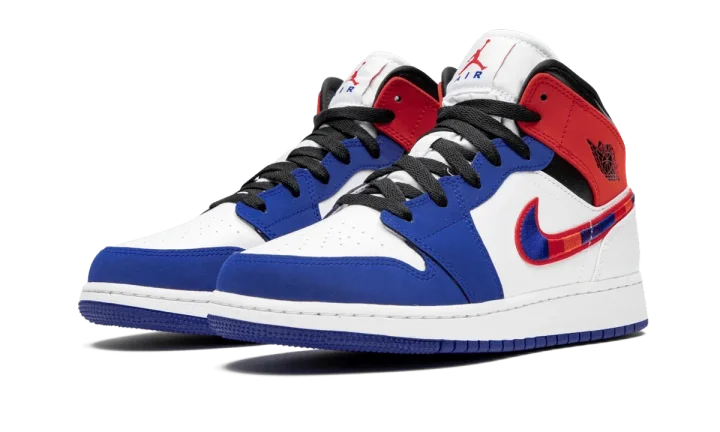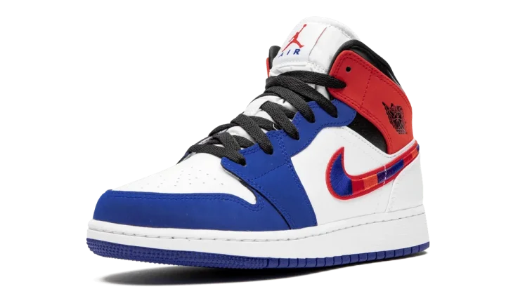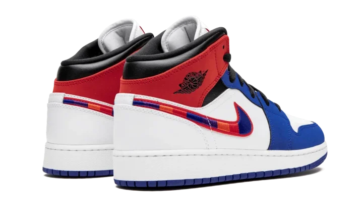 The Air Jordan 1 Mid "University Red/Rush Blue (GS) is the youth sizing of the classic silhouette that originally debuted back in the mid-80s. Nods to two iconic Jordan 1 colorways, the "Chicago" and "Royal" makeups, are featured throughout the look of the tiny model. Blue nubuck overlays around the forefoot and eyelets are contrasted by a white leather base that appears on the perforated toe and mid-panel. Black cotton laces and a vibrant multi-colored embroidered Swoosh on the mid-panel are contrasted by bold red nubuck around the collar. A black Wings logo on the collar and Jumpman branding on the tongue completes the look of the children's sizing of the Air Jordan 1 Mid.