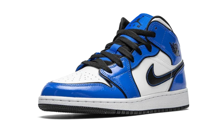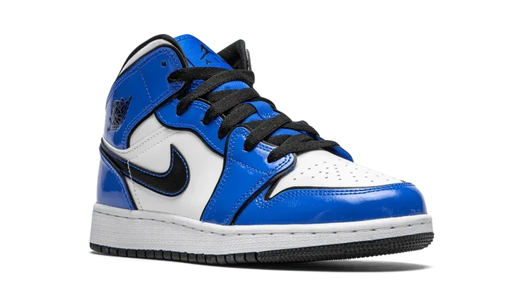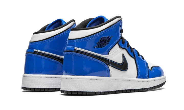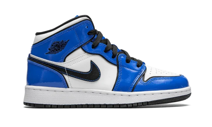 The Air Jordan 1 Mid GS "Signal Blue" is the youth sizing of Michael Jordan's first signature shoe in an Orlando Magic inspired colorway for kids. The Air Jordan 1 Mid is as popular as it's ever been in recent years due to refreshing looks like the "Signal Blue" that add to the iconic silhouette's story. Jordan Brand adds shining patent leather overlays in the shade of royal blue to the forefoot, eyelets, collar, and heel. The same hue of blue also appears on the tongue and nylon tongue tag with black Jumpman branding. Blue contrast stitching borders the black leather Swoosh and a black "Wings" insignia is located on the collar. The perforated toe, mid-panel, and collar are finished off in white leather to complete the look.