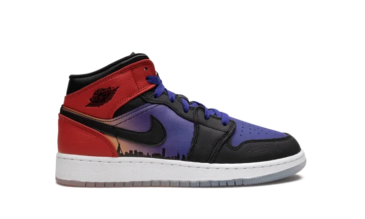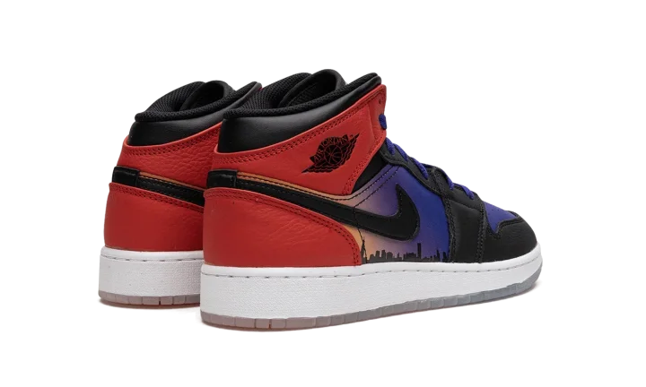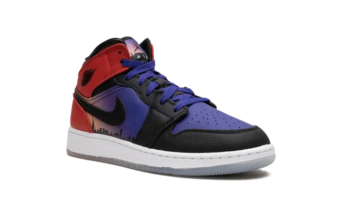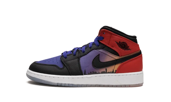 The Air Jordan 1 Mid GS "Skyline" is the youth sizing of the popular lifestyle shoe in a colorway that pays tribute to Chicago's skyline. The "Skyline" Jordan 1 Mid is inspired by Chicago's skyline, which served as the backdrop in the iconic photo of Michael Jordan dunking a basketball while doing the famous Jumpman pose. Psychic Purple leather appears on the shoe's perforated toe while contrasting black leather is found on the overlays on the toe cap, forefoot, and eyelets. Fiery University Red leather lands on the collar and heel. The highlights of the shoe are the graphic of Chicago's skyline on the mid-panel and the photo of Jordan doing the Jumpman pose on the tongue tag. A gradient purple-to-orange-to-red design is found beneath the clear rubber outsole. Release date: March 29, 2023