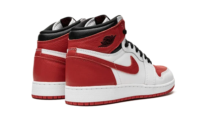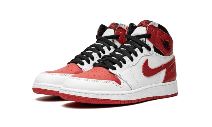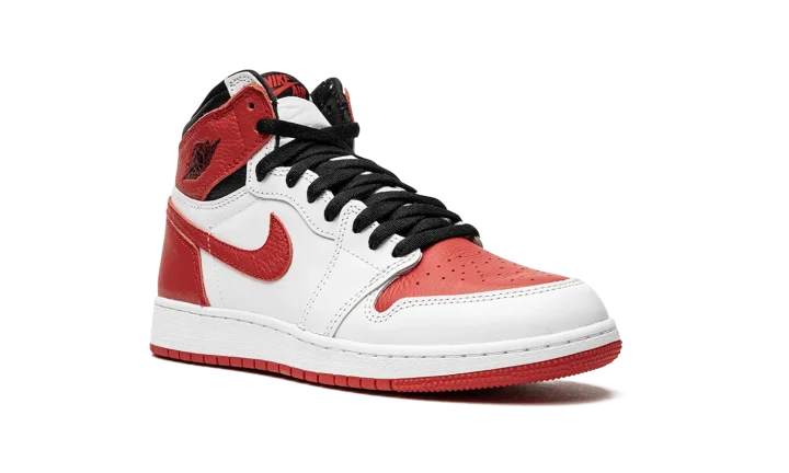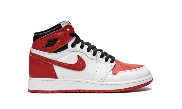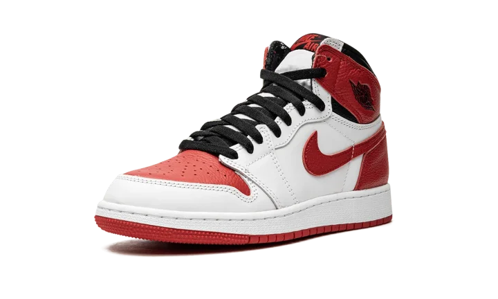 The Air Jordan 1 High OG GS "Heritage'' is the kids version of a May 2022 release of an iconic yet classic basketball shoe that comes in a familiar black, white and red colorway. The sneaker mirrors the same color blocking as the 1985 sample that inspired the Travis Scott x fragment Air Jordan 1, but with red replacing the blue hue. The "Heritage" features a white leather base and upper along with University Red overlays on the toe box, Swoosh, heel counter, and ankle panels accompanied by black on the ankle collar, Jordan Wings logo and laces. The woven tongue tag is colored in black and red with a white midsole and red outsole to complete this timeless sneaker in children's sizing. Release date: May 25, 2022
