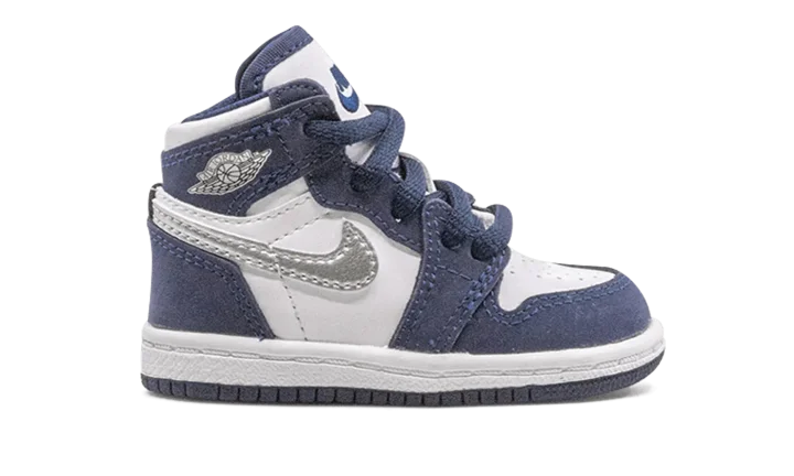 The Jordan 1 High Co.Jp TD "Midnight Navy" is the toddler sizing of a former Japan exclusive colorway of Michael Jordan's first signature shoe. Nike's celebrated "Concept Japan" collection from the early 2000s returned on a global scale in 2020, marking the first time shoes like the "Midnight Navy" were made available to a wide audience of people. As it was back then, the colorway remains fresh and versatile today. A white leather construction on the perforated toe, mid-panel, and collar allows for the Midnight Navy suede overlays in a synthetic nubuck material to garner attention. A Metallic Silver leather Swoosh appears on both sides of the shoe and a small silver "Wings" graphic is printed on the collar. Classic blue "Nike" embroidery is stitched onto the white leather tongue. Release date: November 14, 2020.