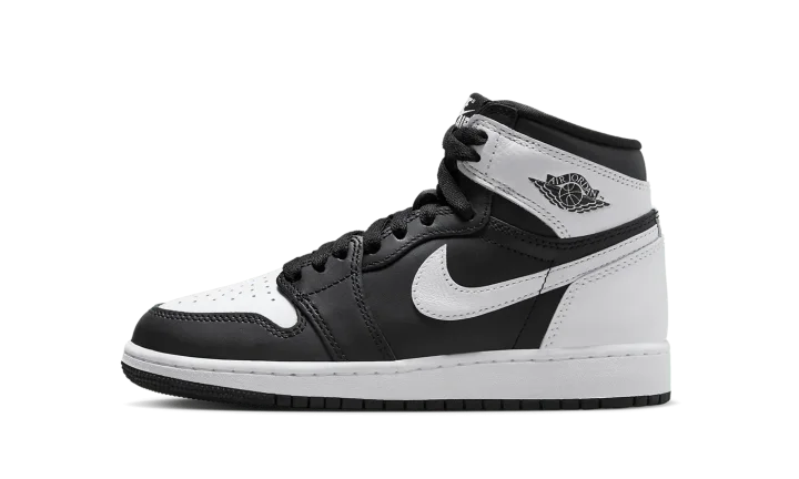 The Air Jordan 1 High OG GS "Black/White" is the youth sizing of the retro basketball shoe in an easy-wearing style. The Jordan 1 High OG "Black/White" features a two-tone, black-and-white appearance, with white leather appearing on the perforated toe and on the collar and heel. Black leather can be found on the toe cap, forefoot, eyelets, and mid-panel. A white leather Swoosh is seen on both sides, and A "Wings" logo appears on the collar. "Nike Air" branding is located on the tongue tag. Underfoot, the shoe's white midsole and black outsole complete the look. Release date: February 24, 2024