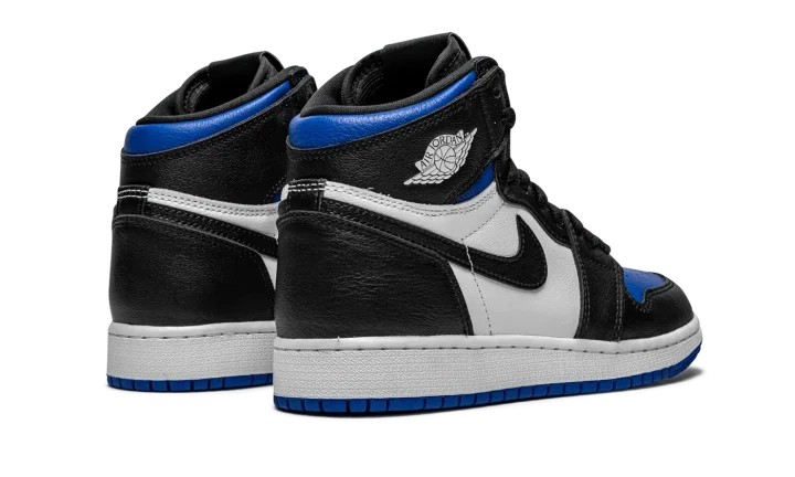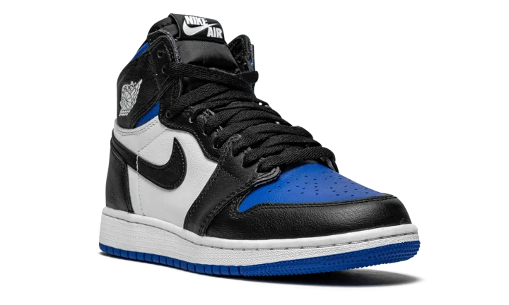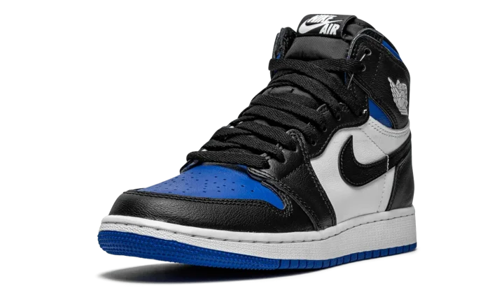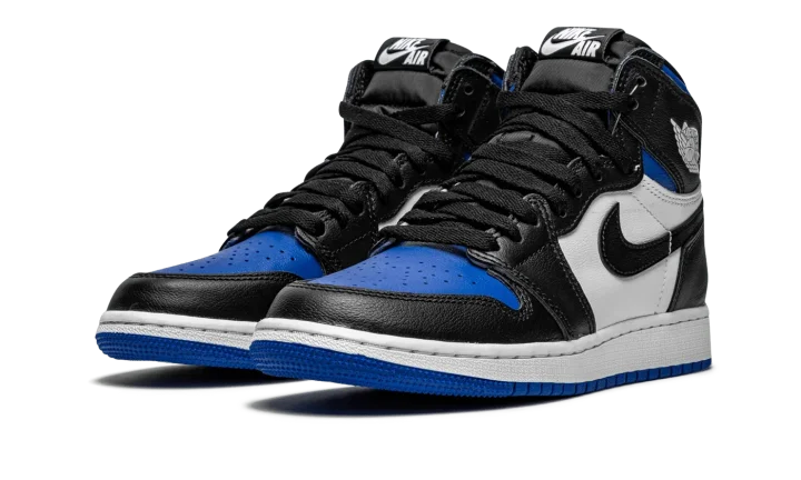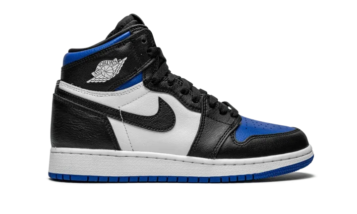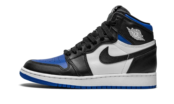 The Air Jordan 1 GS "Royal Toe" is the youth sizing of the popular summer 2020 colorway. Using the same color block of the OG-inspired Jordan 1 High "Bred Toe," this edition features a white leather mid-panel, a black leather heel and collar, and royal blue panels on the toe and ankle. Contrasting black leather overlays appear on the forefoot and eyelet. A black leather Swoosh covers each side and white Wings branding can be found on the collar. White "Nike Air" graces the tongue tag to complete the look. Release date: May 9, 2020.