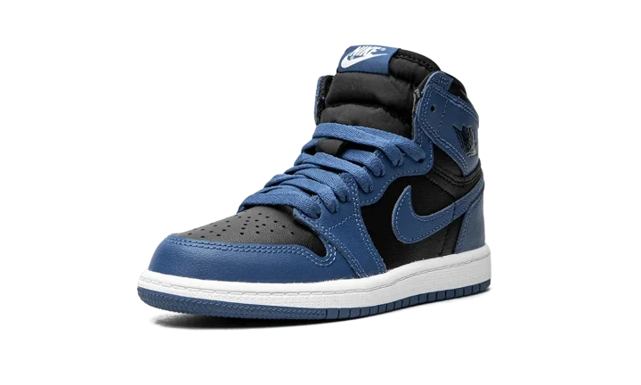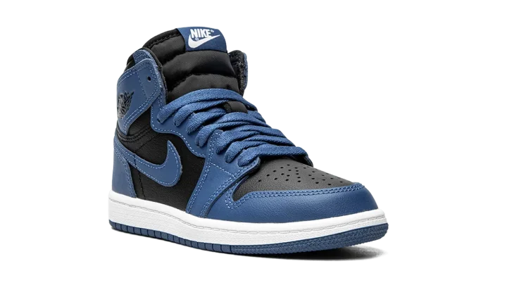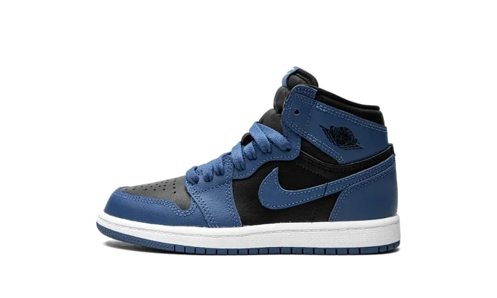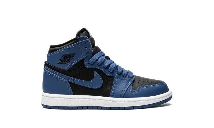 The Air Jordan 1 High OG PS "Dark Marina Blue" is the preschool sizing of Michael Jordan's first signature shoe in a colorway that mimics the appearance of an original, iconic Jordan 1 style. The shoe we're referring to is the Air Jordan 1 "Royal" in black and royal blue, which was originally released by Nike back in 1985. The "Dark Marina Blue" appears in a similar blue hue, and with a slightly altered color block in comparison to the original "Royal." The black leather base contrasts the Dark Marina Blue leather overlays and Swoosh branding. A black "Wings" logo is found on the collar. Classic "Nike" and Swoosh branding appear in white on the tongue tag. Release date: January 15, 2022 (Europe) / February 16, 2022 (USA)