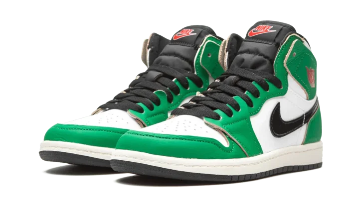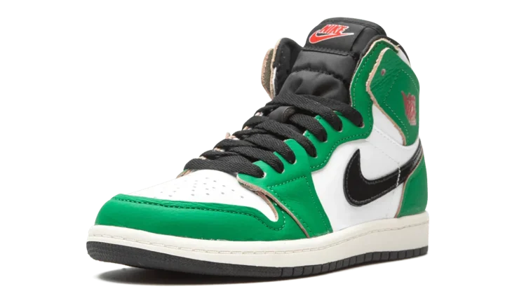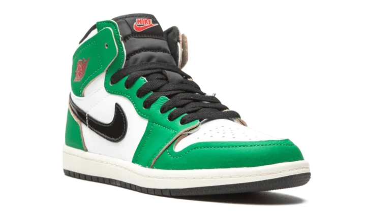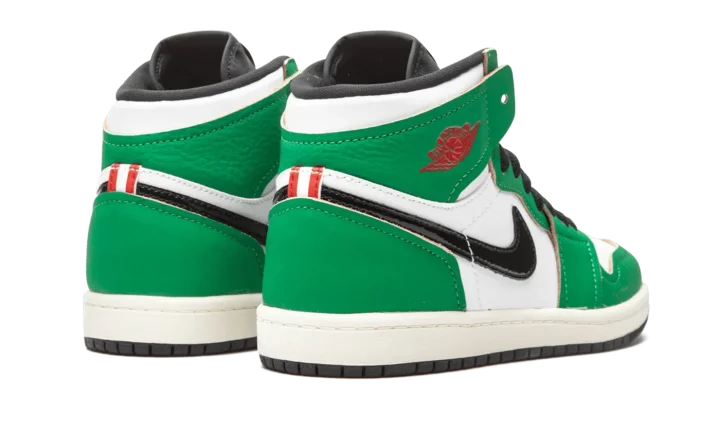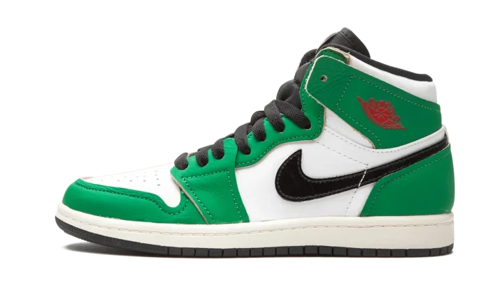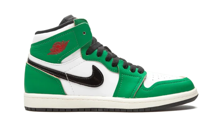 The Air Jordan 1 PS "Lucky Green" is the youth sizing of Michael Jordan's first signature shoe that pays homage to his 63 point performance against the Boston Celtics in 1986. Interestingly enough, the "Lucky Green" makeup also salutes the Nike SB Dunk Low "Heineken" from 2003 as it displays a similar green, white, and red color combination as that legendary skate shoe. The upper features Lucky Green tumbled leather overlays on the forefoot, eyelets, collar, and heel. A white leather base balances the appearance. Black Swoosh detailing dots the mid-panel and red "Wings" accenting can be found on the green leather overlay on the collar. A black nylon tongue, black shoe laces, and red Nike branding on the tongue finish off the look of the Jordan 1 "Lucky Green" in youth sizing. Release date: October 14, 2020.
