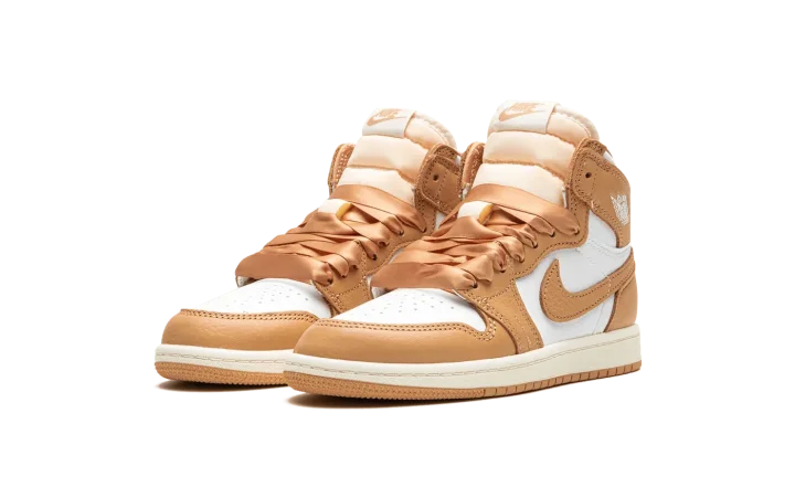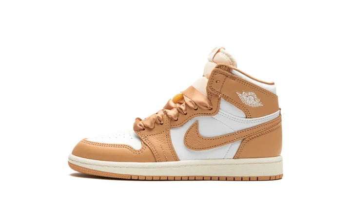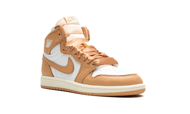 The Air Jordan 1 High OG PS "Praline" is the preschool sizing of the retro basketball shoe with a luxurious vibe. Released in women's sizing for adults, the "Praline" Jordan 1 High OG was also produced in children's sizes. The shoe's design features a white leather upper contrasted with Praline, or tan, leather overlays and a Praline leather Swoosh. Satin ribbon-style laces replace the Jordan 1's original laces for an opulent look. Other details include a white "Wings" logo on the collar and a Praline-colored Nike logo on the tongue tag. Underfoot, a cream rubber midsole and tan rubber outsole complete the look. Release date: September 13, 2023