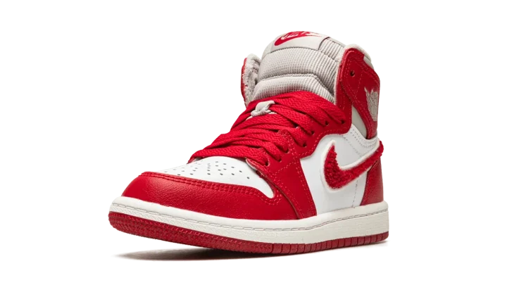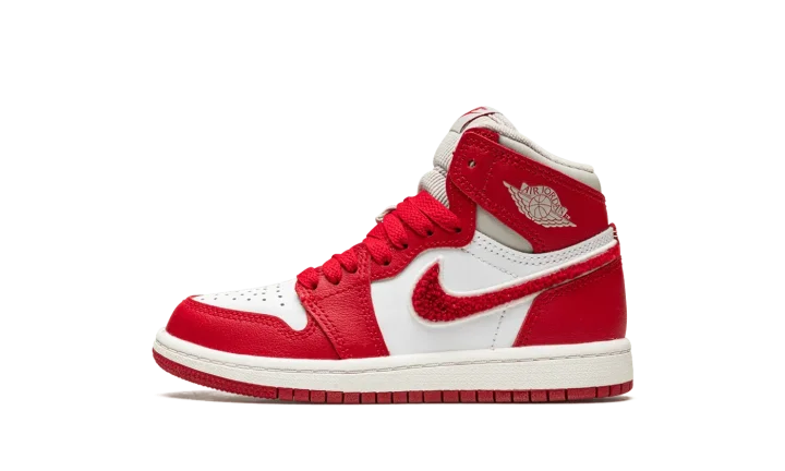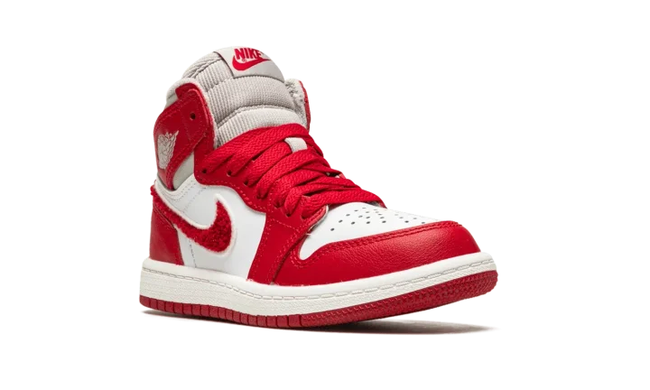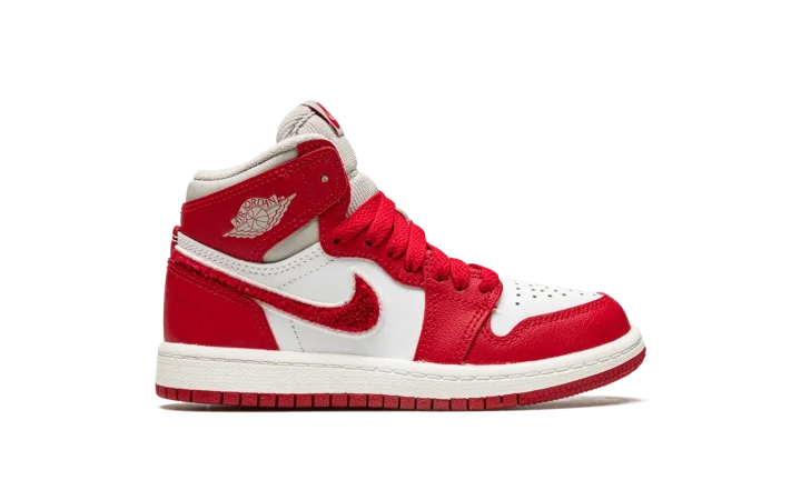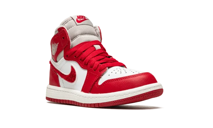 The Air Jordan 1 High OG PS "Varsity Red" is the youth sizing of the retro basketball shoe with a premium build. Also known as the "Newstalgia," this July 2022 release of Michael Jordan's first signature shoe looks to vintage varsity letterman jackets, specifically the chenille patches that are often found on their design, for inspiration. The shoe's perforated toe and mid-panel are designed in white leather. Contrasting Varsity Red leather appears on the overlay panels. The side Swooshes are designed in a fiery red chenille material. A light grey "Wings" logo appears on the collar. Additional design elements include a grey corduroy collar, red "Nike Air" branding on the tongue tag, and red laces. Release date: July 20, 2022