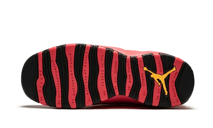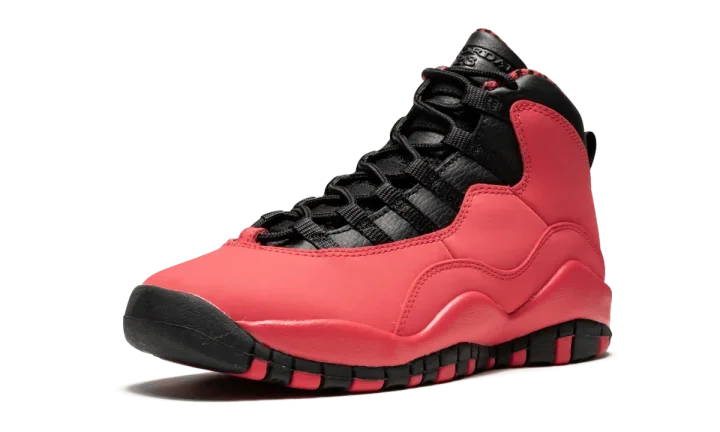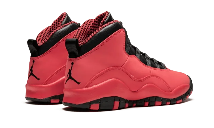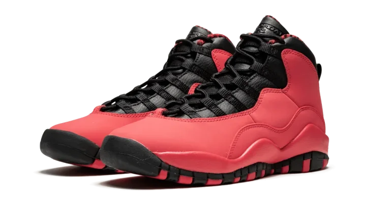 Red and black leather Air Jordan 10 Retro sneakers from jordan featuring a round toe, a lace-up front fastening, an ankle length, branded heel counter, a pull tab at the rear and a rubber sole. These styles are supplied by a premium sneaker and street wear marketplace. Stocking only the most sought-after footwear and clothing, they source and curate some of the most hard-to-find items from around the world.