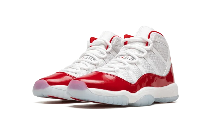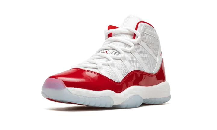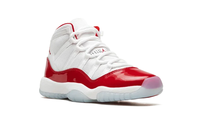 The Air Jordan 11 GS "Cherry" is the youth sizing of the Holiday 2022 release of Michael Jordan's retro basketball shoe in a colorway inspired by the Jordan 11 Low "Cherry" from 2001. Like the original "Cherry" release, the modern version features a two-tone, white and red color scheme that calls to mind Michael's time with the Chicago Bulls. The shoe features a white ballistic mesh upper with tonal webbing eyelets and a fiery Varsity Red patent leather mudguard. Additional red detailing comes into play on the Jumpman on the collar and on the "23" branded heel overlay. The interior lining is also designed in red. Underfoot, the shoe is complete with a white foam midsole and translucent rubber outsole. Release date: December 10, 2022