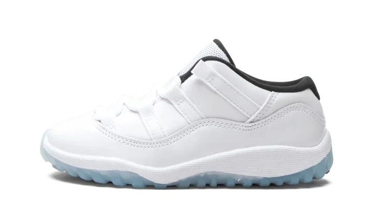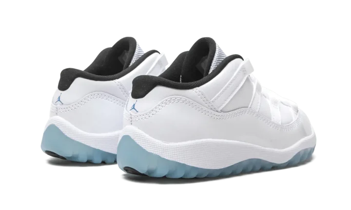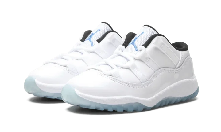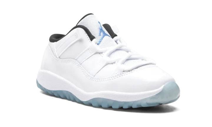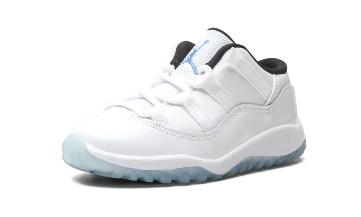 The Air Jordan 11 Low TD "Legend Blue" is the toddler sizing of a colorway based on an original makeup of Michael Jordan's eleventh signature shoe. Nike released the Air Jordan 11 "Columbia" in 1996 as a tribute to Michael's alma mater, the North Carolina Tar Heels. In 2014, the colorway was repackaged as the "Legend Blue" and, in 2021, was converted to a low-top and made available in full family sizing. The design seen here shares many similarities with the original look. A crisp white leather upper and white patent leather mudguard is on par with the "Columbia." A white mesh tongue with Legend Blue "Jumpman Jordan" branding contrasts the look of the black inner lining. A small blue Jumpman appears on the heel. An icy blue semi-translucent outsole completes the look. Release date: May 7, 2021.