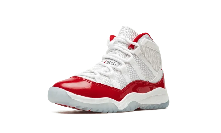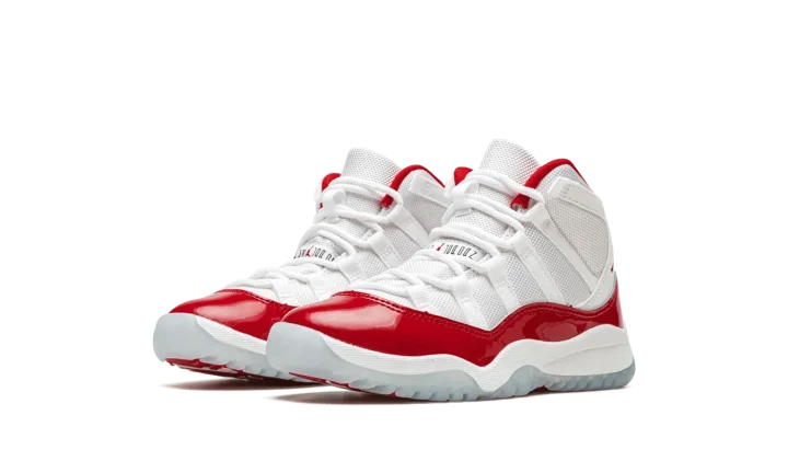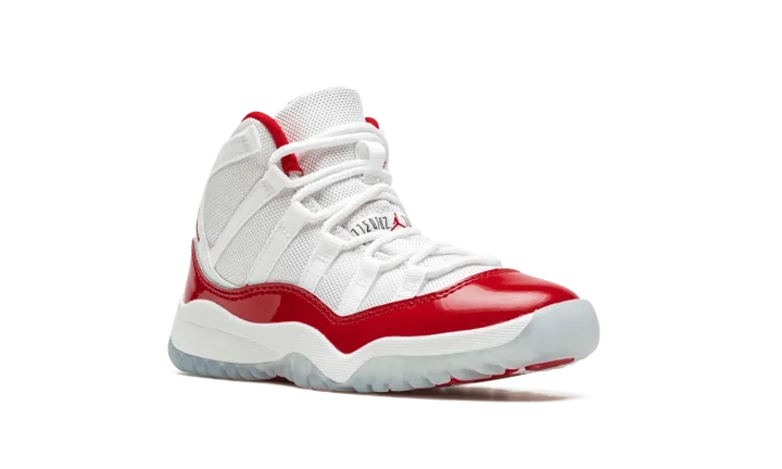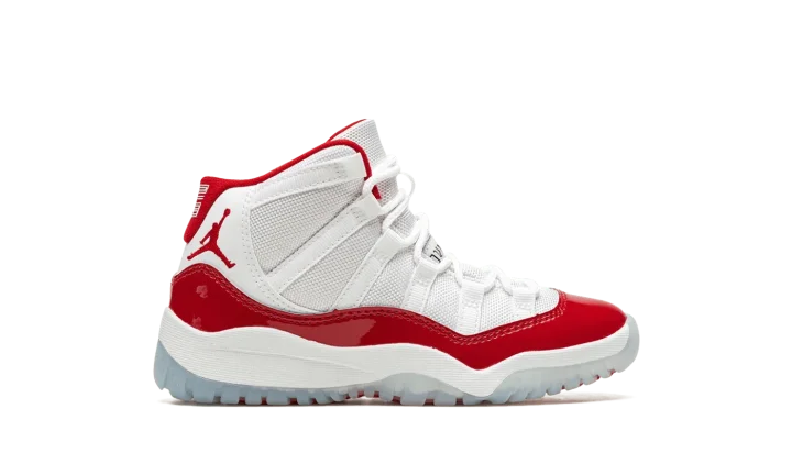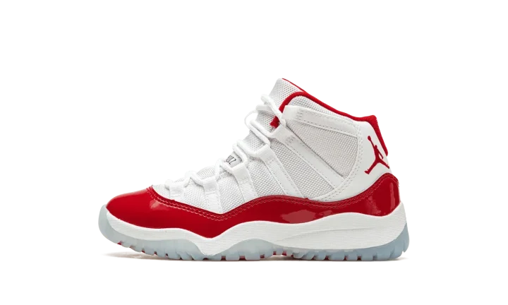 The Air Jordan 11 PS "Cherry" is the preschool sizing of the Holiday 2022 release of Michael Jordan's eleventh signature shoe in a colorway inspired by the Jordan 11 Low "Cherry" from 2001. Like the original "Cherry" release, the modern version features a white and red color scheme inspired by Michael's time with the Chicago Bulls. The shoe features a white ballistic mesh upper with tonal webbing eyelets and a fiery Varsity Red patent leather mudguard. Additional red detailing comes into play on the Jumpman on the collar and on the "23" branded heel overlay. The shoe is complete with a white foam midsole and translucent rubber outsole. Release date: December 10, 2022