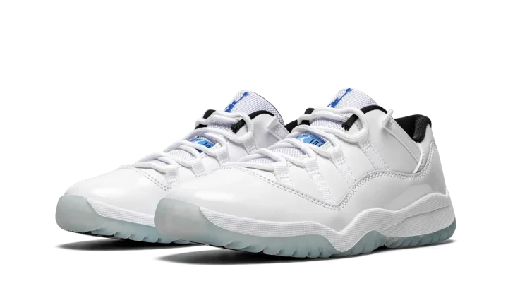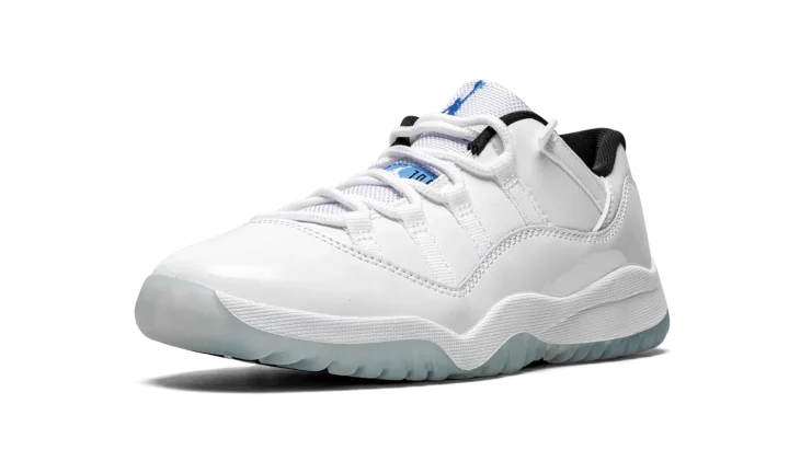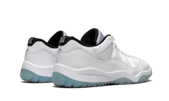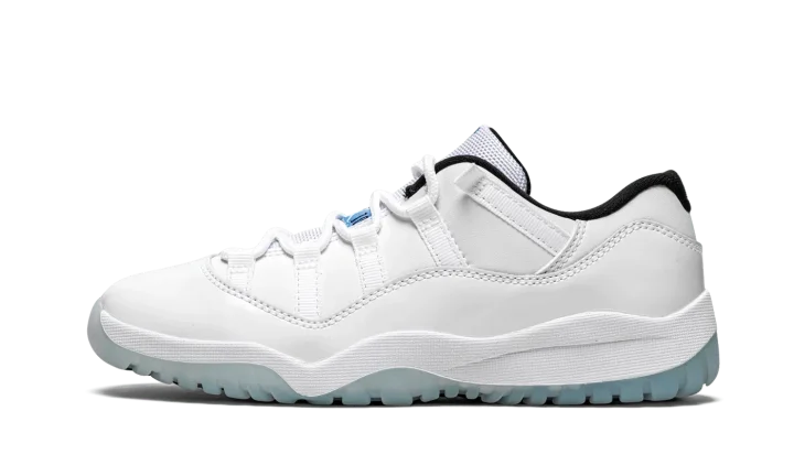 The Jordan 11 Low PS "Legend Blue" is the preschool sizing of the colorway based on an original version of Michael Jordan's eleventh signature shoe. The Air Jordan 11 "Columbia" was released by Nike in 1996 and worn by Michael during the 1996 NBA All-Star Game. Without any official naming by Nike or Jordan, the "Columbia" undoubtedly saluted Michael's alma mater, the North Carolina Tar Heels. In 2014, the "Columbia" was repackaged as the "Legend Blue" and was converted to a low-top on this 2021 release. The "Legend Blue" shares many similarities with the original look. A crisp white leather upper and white patent leather mudguard is on par with the "Columbia." A white mesh tongue with Legend Blue "Jumpman Jordan" branding contrasts the black inner lining. A small blue Jumpman appears on the heel. An icy blue semi-translucent outsole completes the look. Release date: May 7, 2021.