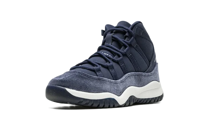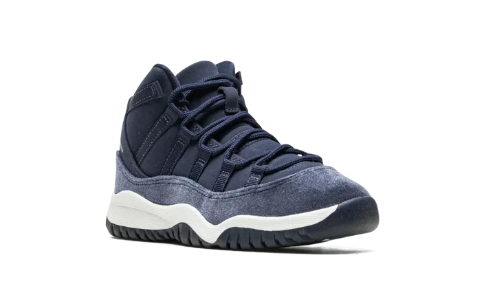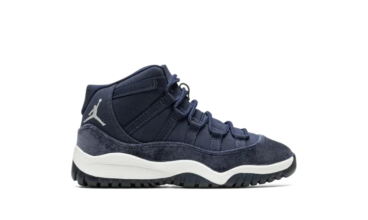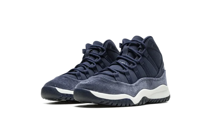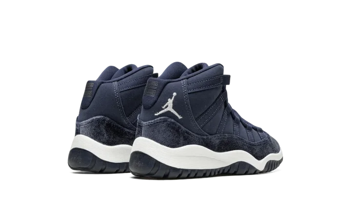 The Air Jordan 11 Velvet PS "Midnight Navy" is the preschool sizing of the colorway of the iconic basketball shoe with a luxury-inspired look. The "Midnight Navy" Jordan 11 has a navy synthetic nubuck upper paired with a navy velvet mudguard. A Metallic Silver Jumpman appears on the collar and "23" branding is found on the heel. Classic "Jordan" branding resides on the middle of the tongue. Underfoot, a white foam midsole and blue outsole complete the look. Release date: November 25, 2022