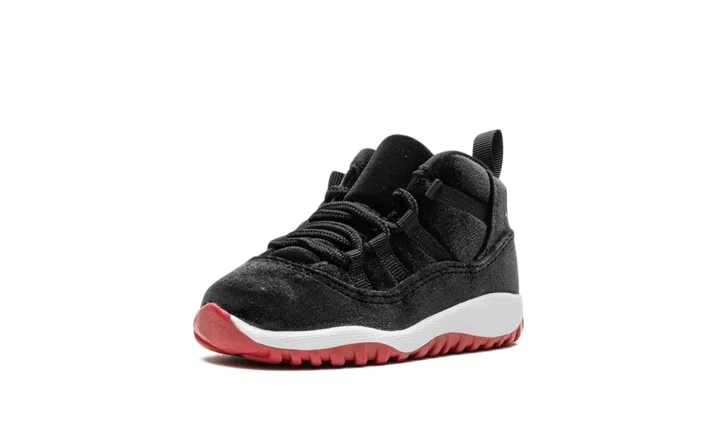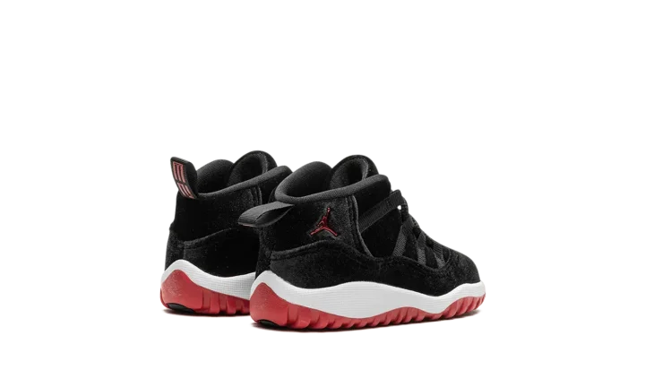 Experience timeless style for tiny feet with the Air Jordan 11 Retro TD "Velvet Bred." This toddler version of the iconic silhouette, nicknamed "Velvet Bred," is draped in luxurious black velvet in place of the usual patent leather, offering a premium and plush feel. The classic black and red colorway ensures they sport a legendary look right from the start. Give your little one a taste of Jordan heritage with this enthusiastic, comfortable, and undeniably stylish release.