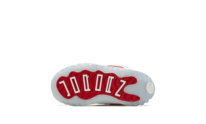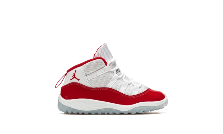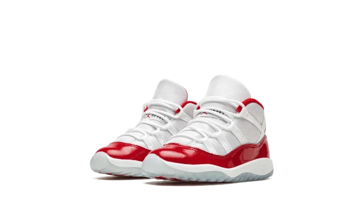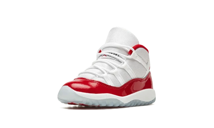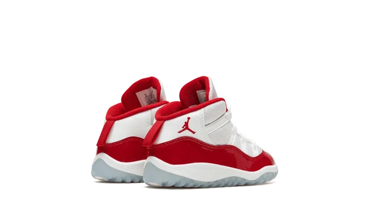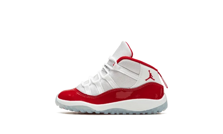 The Air Jordan 11 TD "Cherry" is the toddler sizing of the Holiday 2022 release of Michael Jordan's eleventh signature shoe in a colorway inspired by the Jordan 11 Low "Cherry" from 2001. Like the original "Cherry" release, the modern version features a white and red color scheme inspired by Michael's time with the Chicago Bulls. The shoe features a white ballistic mesh upper with tonal webbing eyelets and a fiery Varsity Red patent leather mudguard. Additional red detailing comes into play on the Jumpman on the collar and on the "23" branded heel overlay. The shoe is complete with a white foam midsole and translucent rubber outsole. Release date: December 10, 2022