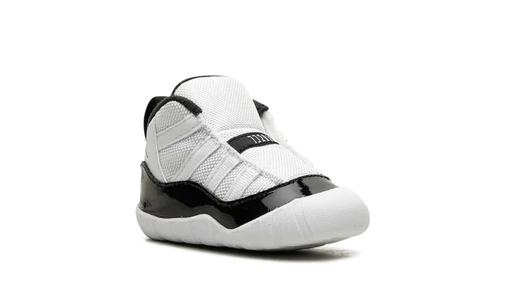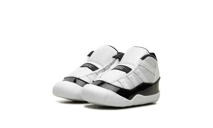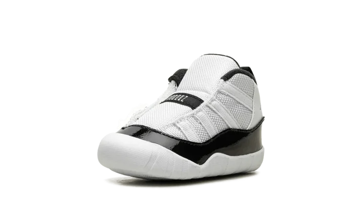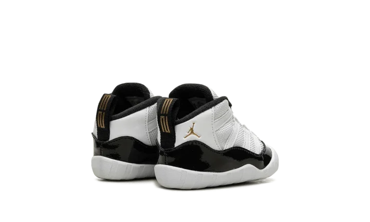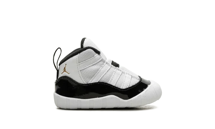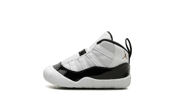 The Air Jordan 11 Crib "Gratitude" is the infant sizing of the Holiday 2023 Air Jordan 11 release. Also nicknamed the "Defining Moment Pack" or simply "DMP" colorway, the Jordan 11 "Gratitude" is based on the retro basketball sneaker's original "Concord" colorway that was worn by Jordan with the Chicago Bulls throughout the team's historic run during the 1995-96 NBA season. The upper features a white ballistic mesh construction with white leather appearing on the heel. A glossy black patent leather mudguard contrasts the shoe's neutral base. Metallic Gold Jumpman branding is found on the collar. Release date: December 9, 2023