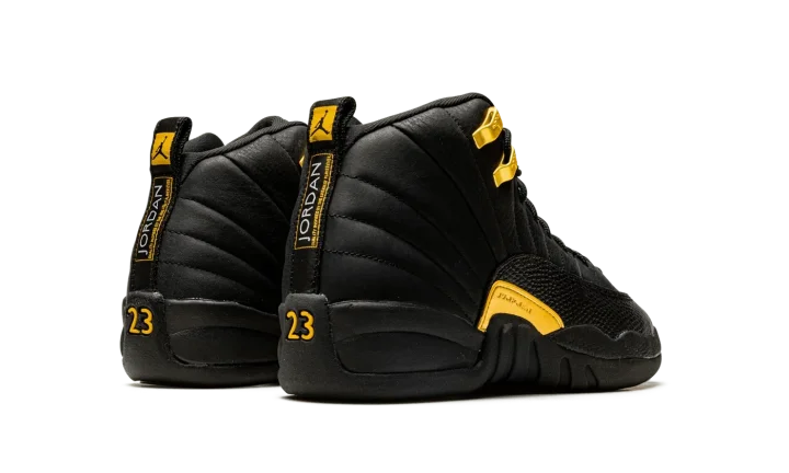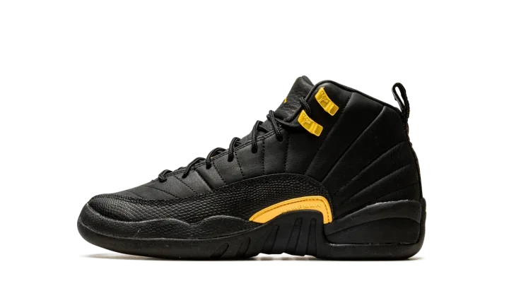 The Air Jordan 12 GS "Black Taxi" is the youth sizing of the mostly monochromatic black colorway of the retro basketball shoe that references its original "Taxi" look, but with a twist. The "Black Taxi," as suggested by its nickname, updates the Jordan 12's original "Taxi" colorway with black accents in lieu of the "Taxi's" predominantly white design. The "Black Taxi" features a black leather upper instead of the "Taxi's" white leather construction. As for the rest of the shoe, a tonal synthetic textured mudguard ties into the colorway's stealthy vibe. Yellow accents come into play on the eyelets and on the midfoot overlay with "Jumpman" branding. Additional pops of yellow are found on the embroidered Jumpman and "Two 3" logos on the tongue. Release date: December 3, 2022