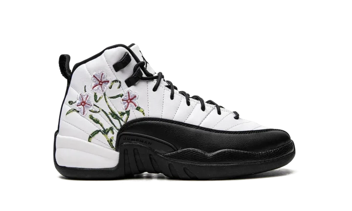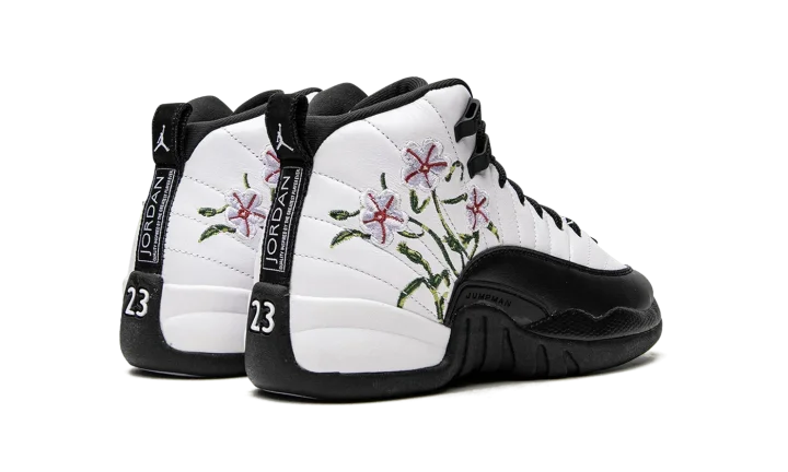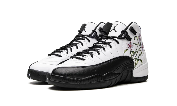 The Air Jordan 12 GS 'Floral" is the youth sizing of the retro basketball shoe in a colorway with embroidered flower detailing on its design. The Jordan 12 GS "Floral" updates Michael Jordan's twelfth signature shoe with a unique floral design while also referencing the model's original "Taxi" colorway. The shoe features a white leather upper with a contrasting black synthetic mudguard on the toe and forefoot. A floral motif is embroidered on either side of the shoe. Black Jumpman and "Two 3" branding is found on the white leather tongue. A white Jumpman appears on the black rubber outsole. Release date: October 19, 2022
