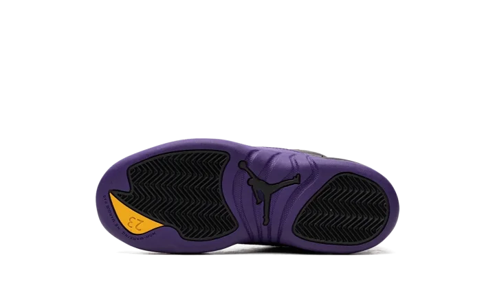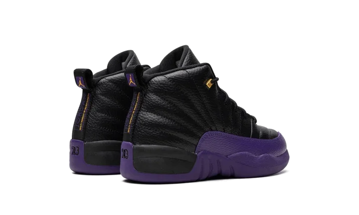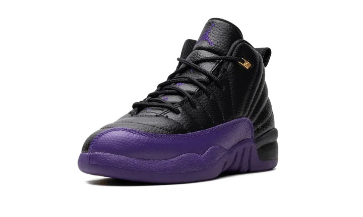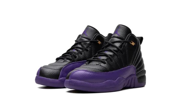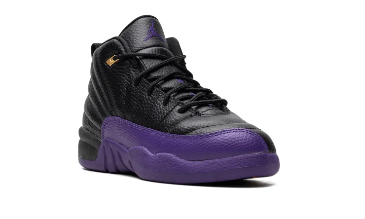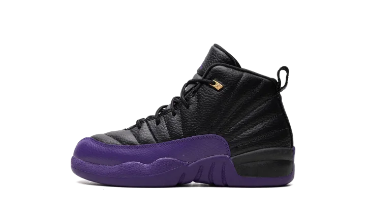 The Air Jordan 12 PS "Field Purple" is the preschool sizing of the retro basketball shoe in a colorway seemingly inspired by the Player Exclusive version of the Jordan 12 worn by former Sacramento Kings guard Mike Bibby. Reminiscent of the Jordan 12 Low that Bibby wore frequently with the Kings in the early 2000s, the "Field Purple" features a black leather upper with a purple textured leather mudguard. Metallic Gold eyelets give the shoe a premium look. Classic Jumpman branding appears on the lateral side of the midsole and purple Jumpman and "Two 3" detailing are embroidered on the black leather tongue. The shoe is mounted on a purple sole. Release date: July 29, 2023