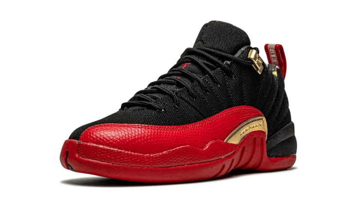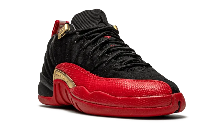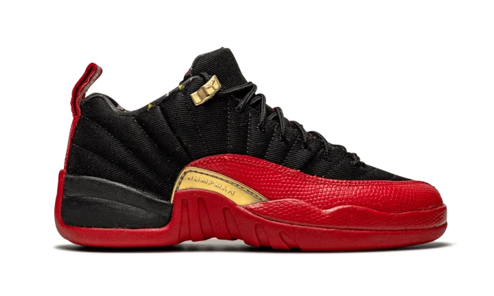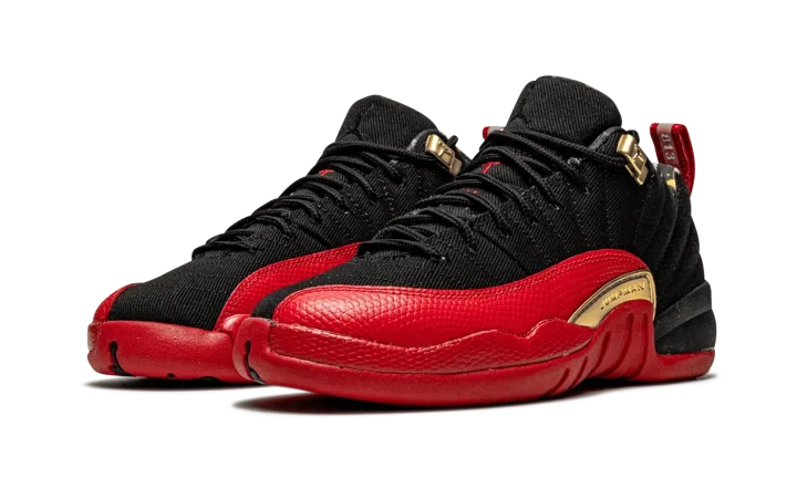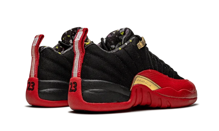 The Air Jordan 12 Low GS "Super Bowl LV" is the youth sizing of Michael Jordan's twelfth signature shoe in a colorway dedicated to the NFL's ultimate game. Released by Jordan Brand in February 2021 prior to Super Bowl LV (55), this low-top Jordan 12 features various football references in its design, beginning with the Vince Lombardi Trophy inspired gold accenting on the mid-panel and confetti-style pattern on the liner. The rest of the design is reminiscent of the iconic "Flu Game" colorway worn by Michael during the '97 NBA Finals. A Varsity Red textured leather overlay appears on the forefoot and a black canvas material forms the base of the shoe. Black Jumpman embroidery can be found above the red "Two 3" branding on the middle of the tongue. While the aforementioned designs tie in with the team uniform colors of the Chicago Bulls, the "ribbon" style design on the heel is a reference to the old team uniform colors of the Tampa Bay Buccaneers, one of the two teams in Super Bowl LV, and the host city of the event, as well. Release date: February 6, 2021.