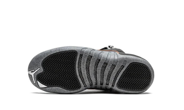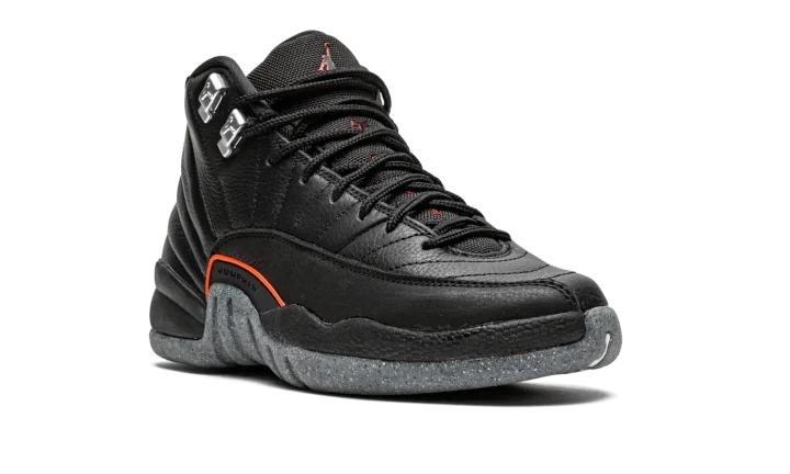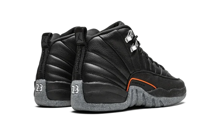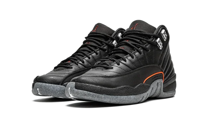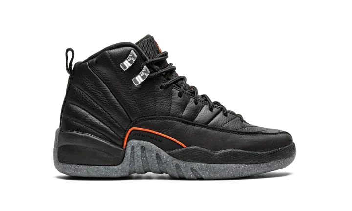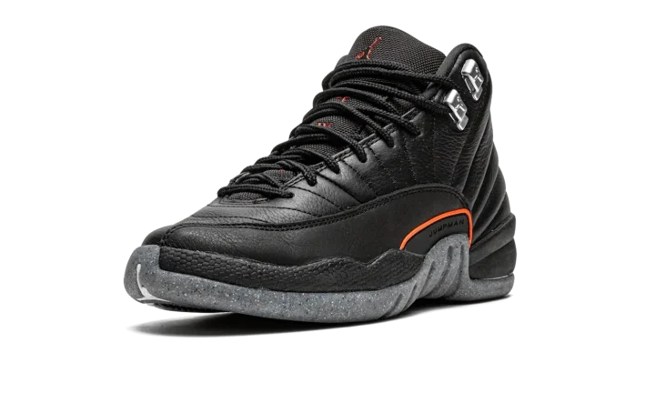 The Air Jordan 12 GS "Utility" is the youth sizing of the modified version of the retro basketball shoe that recruits Nike's environmentally friendly "Grind" material into the sole. An August 2021 release, the Jordan 12 "Utility" advances the design of Michael Jordan's twelfth signature shoe that once introduced Nike's Zoom Air technology into the Air Jordan line in 1997. Here, details include a black tumbled leather upper paired with a black synthetic nubuck mudguard. Red piping borders the "Jumpman" branding on the lateral side. The tongue appears in a rugged black ballistic mesh textile. Other details include a black painted midsole with a faux lizard skin finish and an outsole constructed from Nike's "Grind" composition, which contains up to 3% recycled materials. Release date: August 21, 2021