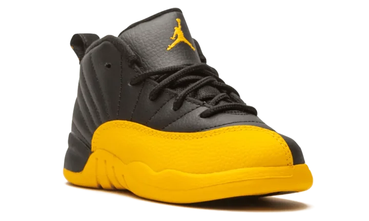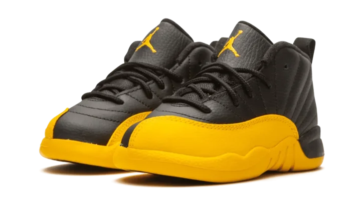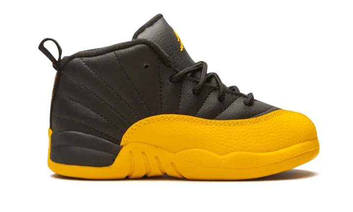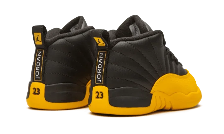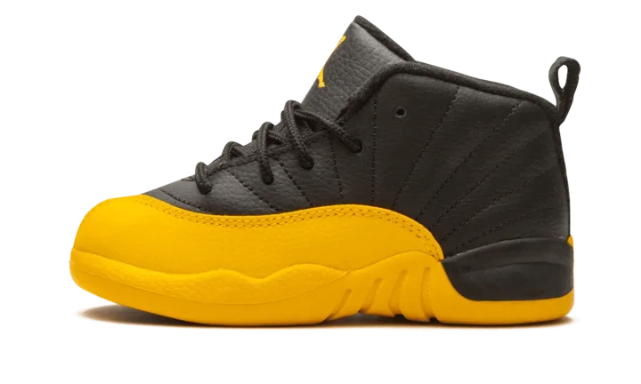 The Jordan 12 TD "University Gold" is the toddler sizing of Michael Jordan's classic signature shoe that was originally released in the late-90s. The "University Gold" is equipped with a two-toned colorway that features a black leather upper and contrasting yellow lizard-patterned leather mudguard. The rest of the design is kept understated with black laces and a black leather tongue allowing for the embroidered yellow Jumpman on the tongue to garner attention, just as its adult sizing counterpart. Release date: July 18, 2020.