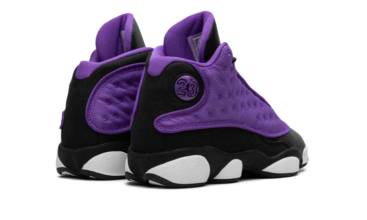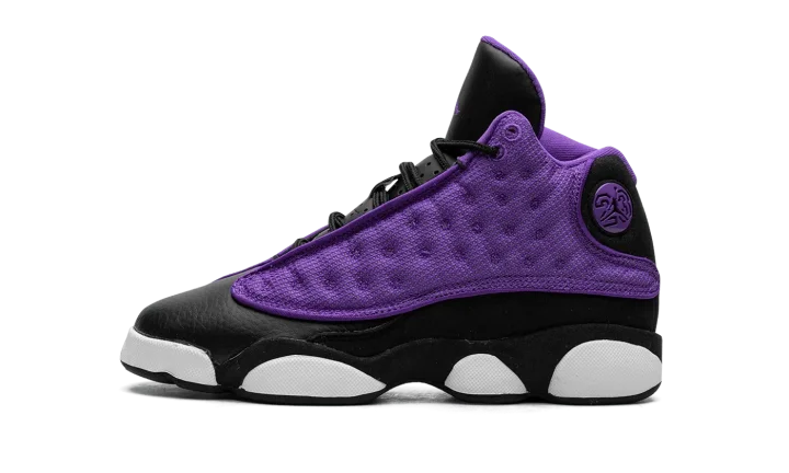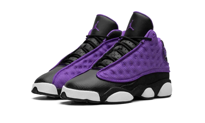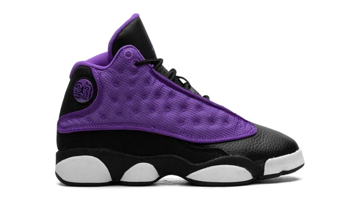 The Air Jordan 13 GS "Purple Venom" is the youth sizing of the retro basketball shoe with an eye-catching purple design. Michael Jordan's thirteenth signature shoe receives a bold makeover on the "Purple Venom" as the bright shade of purple appears on the dotted mesh panel on the upper. Black leather forms the base of the shoe. The Jordan 13's usual holographic panther eye emblem on the lateral side of the ankle is replaced with a molded plastic "23" logo. A purple Jumpman is embroidered on the black leather tongue. Underfoot, white midsole walls complete the look. Release date: October 2, 2023