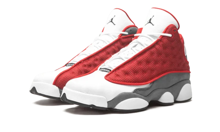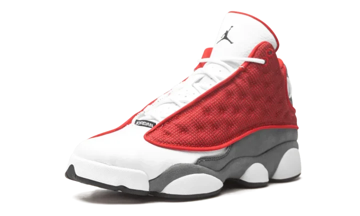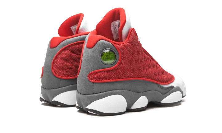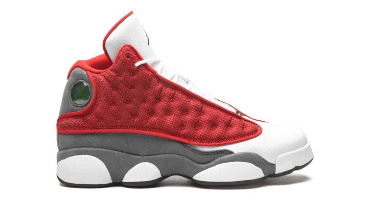 The Air Jordan 13 GS "Red Flint" is the youth sizing of the updated, red-based edition of the "Flint" colorway of Michael Jordan's thirteenth signature shoe. Cast in the same color block as the "Flint," an original colorway of the retro basketball shoe that debuted in 1998, the "Red Flint" substitutes the blue textile upper found on the first "Flint" for a fiery Gym Red hue. The rest of the model is identical to the original "Flint" with white tumbled leather on the toe and dotted leather on the tongue. A holographic emblem can be found on the collar and Flint Grey suede appears on the mudguard above the white midsole walls. A black Jumpman is embroidered on the tongue and "Jordan" text can be found on the black nylon tag on the throat. Release date: May 1, 2021.