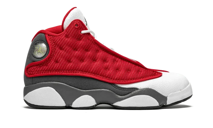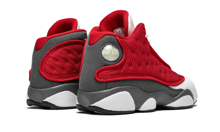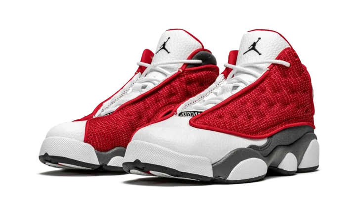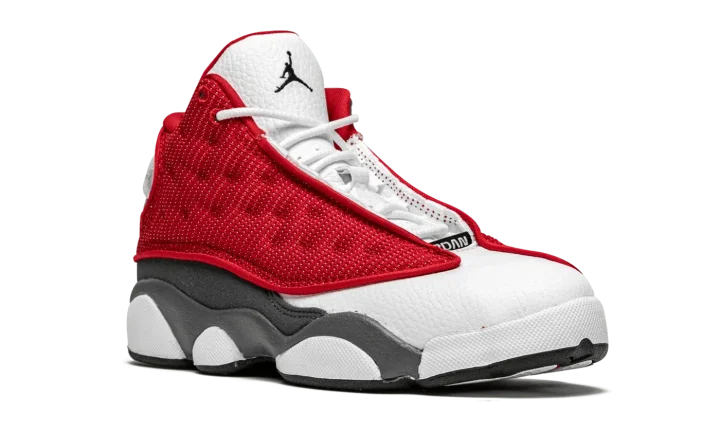 The Air Jordan 13 is the preschool sizing of the popular "Red Flint" version, which looks identical to the "Red Flint" high-top for adults. This iteration is arranged in an identical color block to that model with a head-turning Gym Red hue. The rest of the shoe is made with white tumbled leather on the toe and perforated leather on the tongue with a holographic emblem on the collar and grey suede on the mudguard. A black Jumpman logo is embroidered on the tongue and "Jordan" text appears on the black nylon tag on the throat.