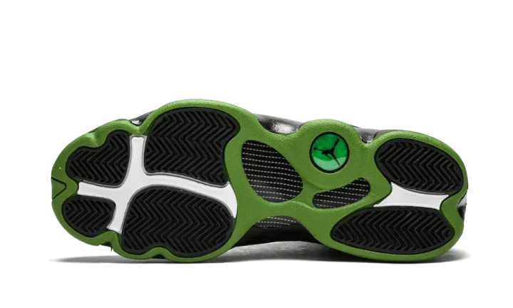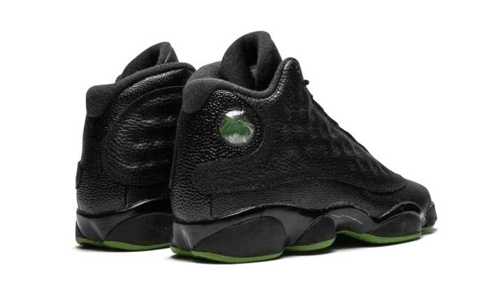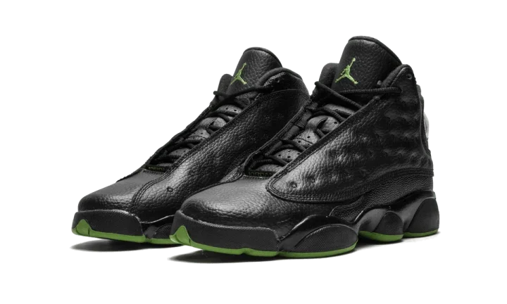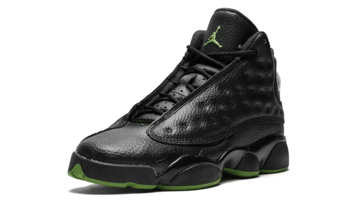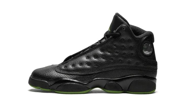 The Air Jordan 13 "Altitude" that came out in 2017 is an update on the original colorway that was first released in 2005. This Air Jordan 13 "Altitude" is the grade school edition and features a predominantly black makeup with an Altitude Green outsole. The sneaker features a tumbled leather upper with a dimpled texture on the side panels. Stingray detailing accents the heel. The holographic element on the ankle showcases a Jumpman logo and Jordan's number 23.