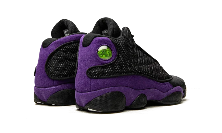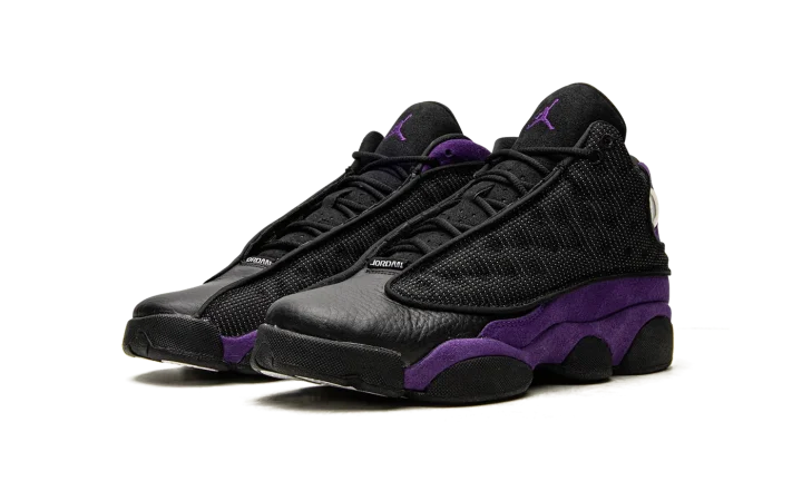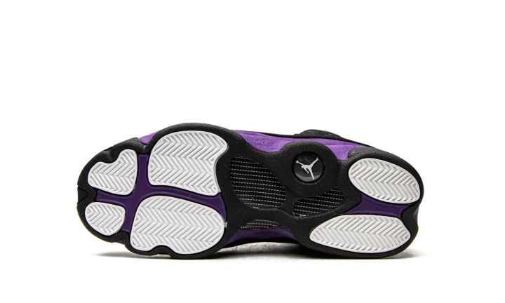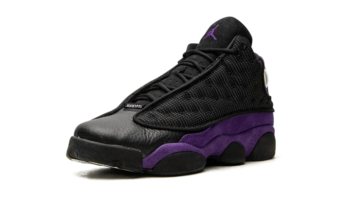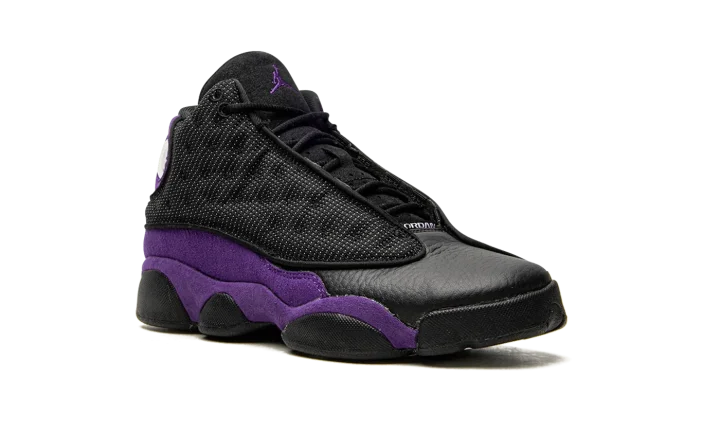 The Air Jordan 13 GS "Court Purple" is the youth sizing of the January 2022 release of Michael Jordan's thirteen signature shoe in a colorway dedicated to the team uniform colors of the Los Angeles Lakers. The "Court Purple" is yet another popular Jordan 13 that salutes the Lakers—the first being the aptly named "Lakers" makeup that was released in July 2019. Sans any official Lakers branding, the "Court Purple" nonetheless features the Lakers' color palette on its design. The "Court Purple" mimics the color block of the Jordan 13's original "Bred" colorway by substituting the red accenting for purple along the heel and mudguard. The black mesh upper is treated to a reflective finish. A holographic emblem denoting Jordan's "Black Cat" nickname, meant to resemble a panther's eye, can be found on the heel. A Court Purple embroidered Jumpman is found on the tongue and white "Jordan" detailing appears on the vamp. Black midsole walls complete the look. Release date: January 8, 2022