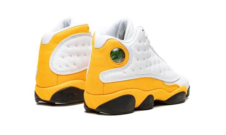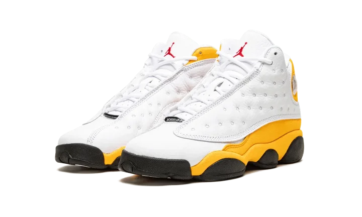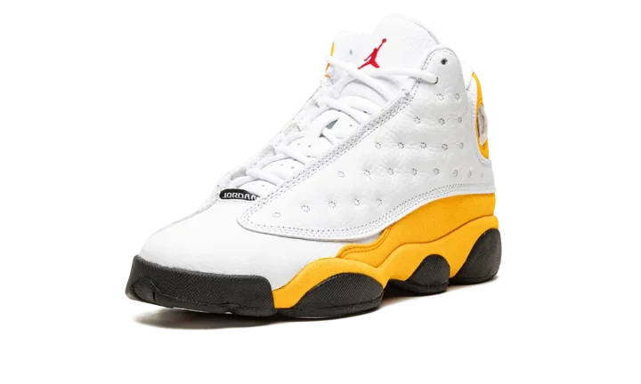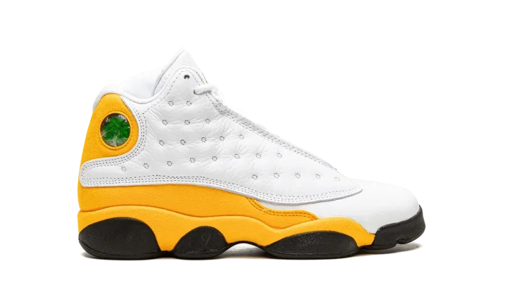 The Air Jordan 13 GS "Del Sol" is the youth sizing of Michael Jordan's thirteen signature basketball shoe in a colorway unofficially inspired by the Los Angeles Lake The "Del Sol" features the team's white and yellow color scheme. Specifically, Del Sol-colored felt appears on the mudguard, heel, and collar. The rest of the upper is outfitted with white leather with dotted embroidery. Branding hits include a black Jordan tag with white lettering on the throat, an embroidered red Jumpman on the white leather tongue, and a holographic emblem on the collar.