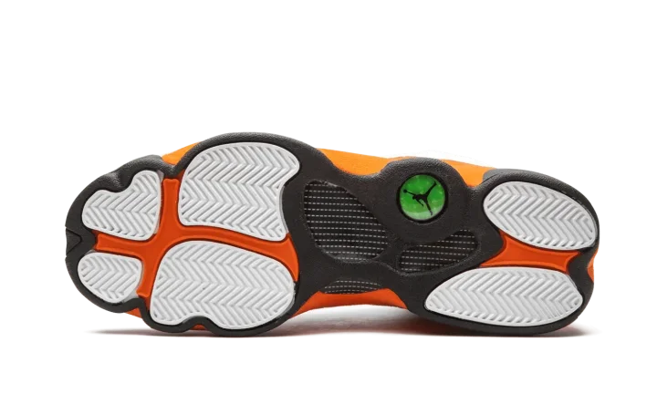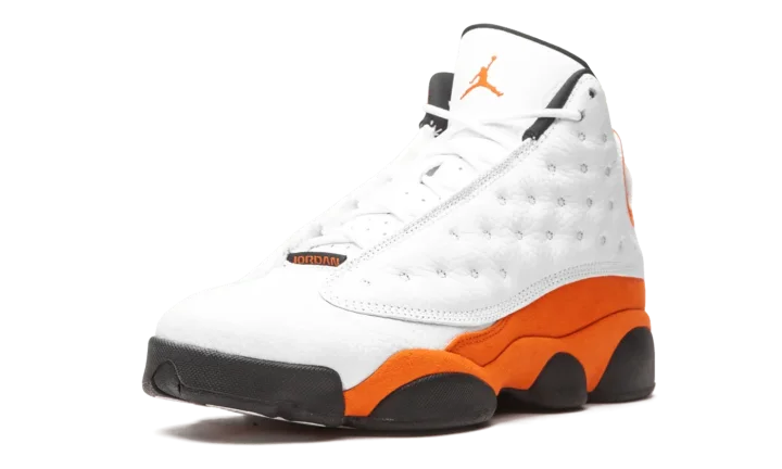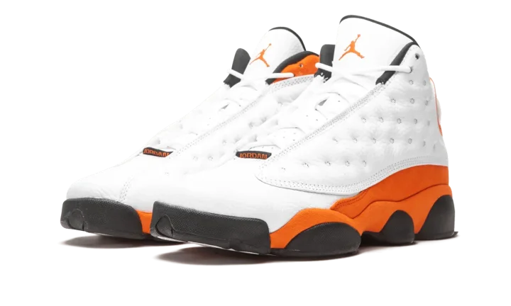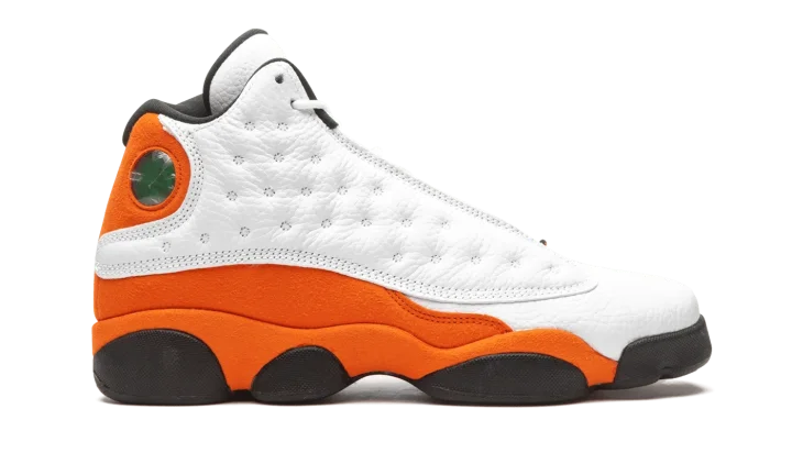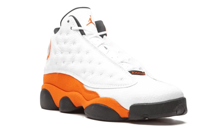 The Air Jordan 13 GS "Starfish" is the youth sizing of Michael Jordan's thirteenth signature shoe in a fiery colorway. The "Starfish" unofficially references the popular "Shattered Backboard" colorway that first appeared on the Air Jordan 1 in 2015. Taking inspiration from the orange, black, and white team uniform colors of Stefanel Trieste, the Italian League basketball team Michael Jordan suited up for during an overseas exhibition game in 1985, the "Starfish" hue is part of the Jordan legacy. White dotted leather can be found on the upper and smooth white leather appears on the toe. A holographic emblem is located on the collar and an embroidered orange Jumpman is stitched onto the white leather tongue. Jordan Brand outfits the mudguard and heel in a Starfish suede material, which adds a burst of color to the design. Black midsole walls and a black liner round out the look of this Air Jordan 13 for kids. Release date: January 16, 2021.