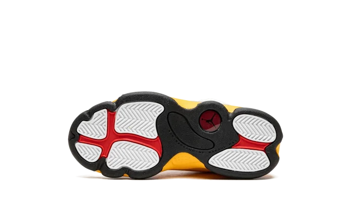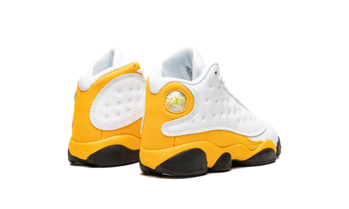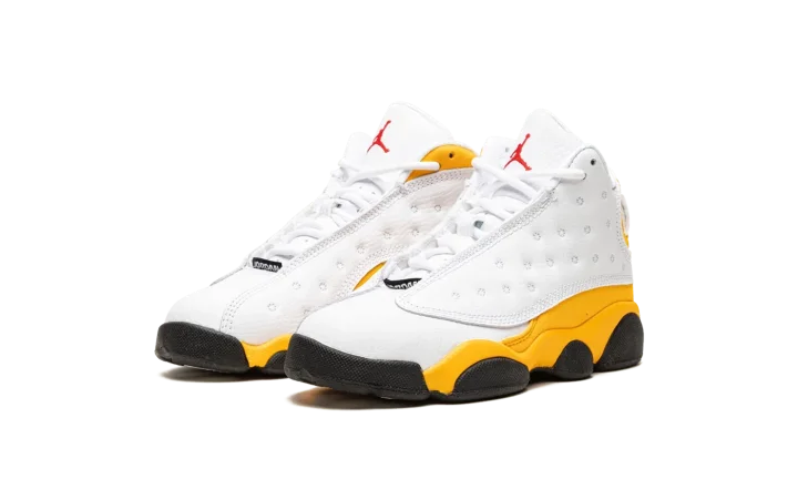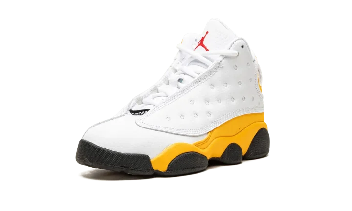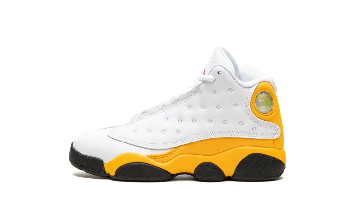 The Air Jordan 13 PS "Del Sol" is the preschool sizing of Michael Jordan's retro basketball shoe in a colorway unofficially inspired by the Los Angeles Lakers. The "Del Sol" features the team's white and yellow color scheme, and is devoid of any of the purple accenting found on the Lakers' team uniforms. Specifically, Del Sol-colored felt appears on the mudguard, heel, and collar. The rest of the upper is outfitted with white leather with dotted embroidery. Branding hits include a black Jordan tag with white lettering on the throat, an embroidered red Jumpman on the white leather tongue, and a holographic emblem on the collar.