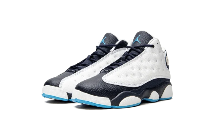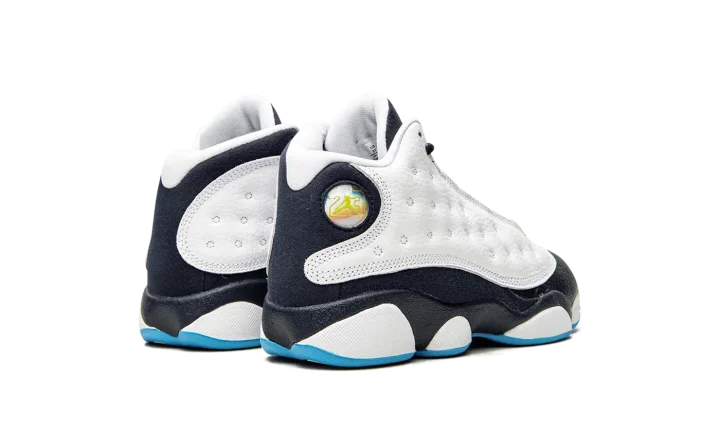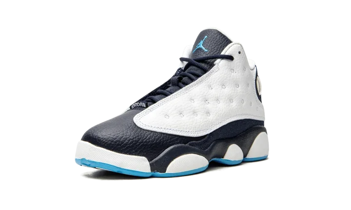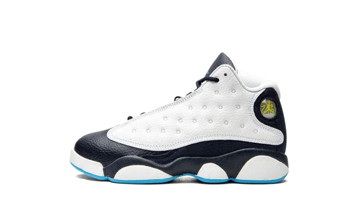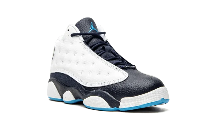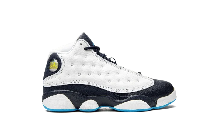 The Air Jordan 13 PS "Obsidian" is the preschool sizing of Michael Jordan's thirteenth signature shoe in a colorway that is reminiscent of some of the shoe's original looks from 1997 and 1998. The "Obsidian" looks to the Air Jordan 13's "He Got Game" and "Chicago" colorways for inspiration with its white tumbled leather upper and contrasting paneling, in this case, arranged in Obsidian (dark blue). The holographic emblem on the collar is a true-to-original design found on the original Air Jordan 13. A Powder Blue Jumpman is embroidered on the Obsidian tumbled leather tongue and white "Jordan" text hits at the vamp. Finishing touches include white midsole walls and Powder Blue traction pods on the outsole. Release date: September 18, 2021