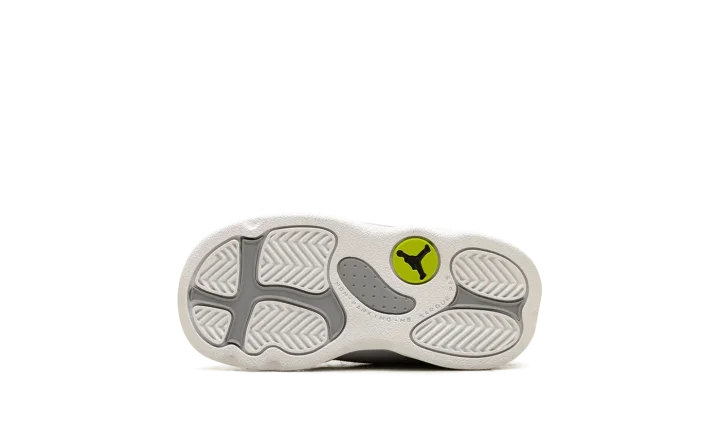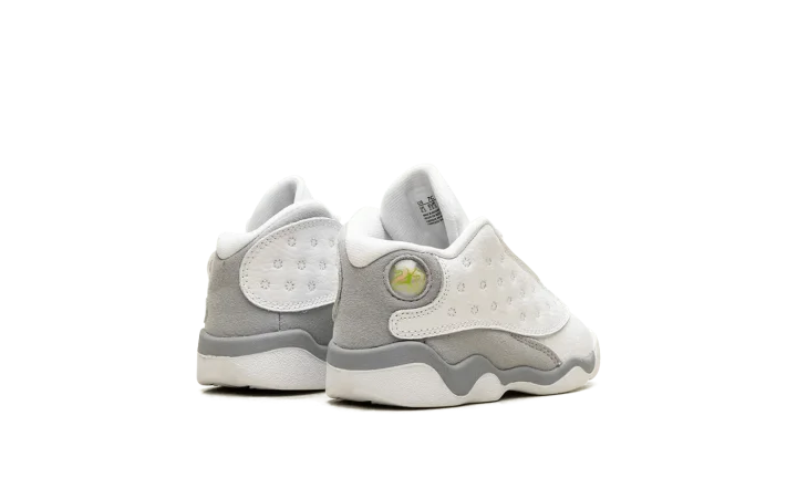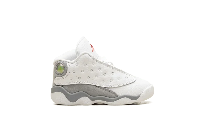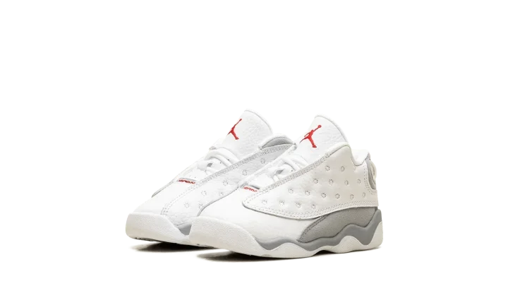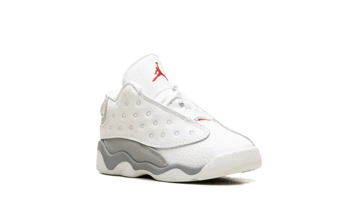 The Air Jordan 13 Retro TD "Wolf Grey" is the toddler sizing of the retro basketball shoe with neutral and red accents. An alternative to the classic "Chicago" theme that has appeared on iconic Air Jordan models, including the Jordan 13, the "Wolf Grey" features Michael Jordan's former basketball team's uniform colors, but with grey details in lieu of black accents. The shoe has a white dotted leather upper with a white leather toe. Wolf Grey suede appears on the side of the shoe. A red Jumpman is embroidered on the tongue. Underfoot, white midsole walls complete the look. Release date: August 5, 2023