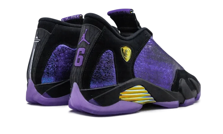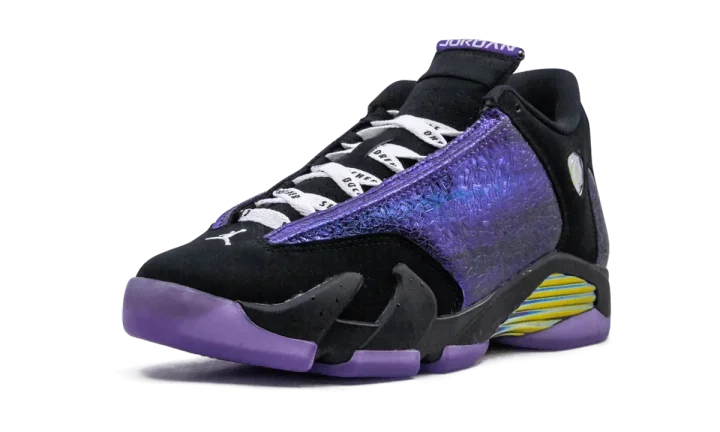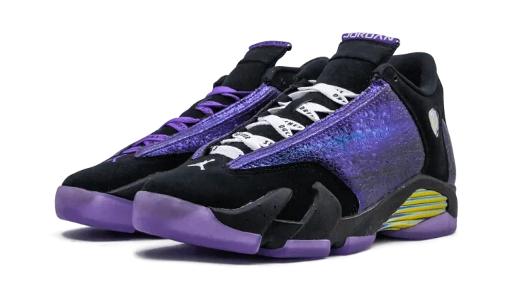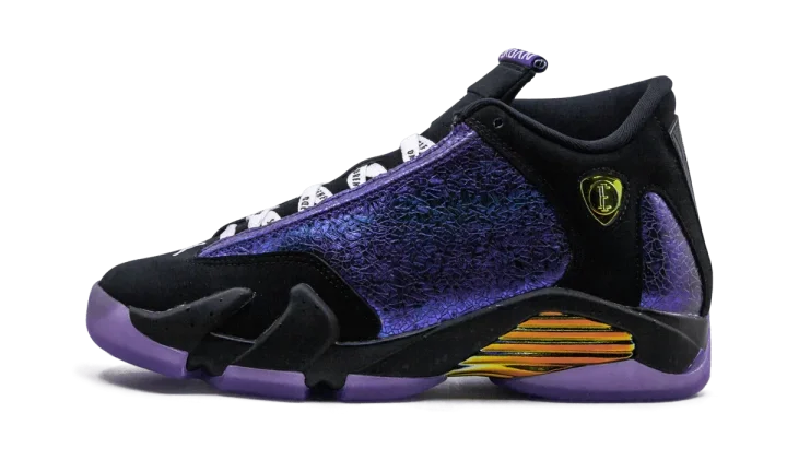 The Air Jordan 14 GS "Doernbecher 2019" is the youth sizing of patient Ethan Ellis's creation for 2019's Nike Doernbecher Freestyle series. Ellis, a lifelong fan of Texas Christian Horned Frogs athletics, decides to feature team-specific details to his version of what the perfect Air Jordan 14 should look like. Based off the TCU color palette, the upper sports a crinkled purple texture on the midfoot and heel. Contrasting black nubuck can be found on the toe, collar and heel. An "EE" logo for his initials replaces traditional Jumpman branding near the collar. The young patient includes details specific to his journey including the number of heart surgeries he has endured, the city of his heart transplant and the name of a friend who went through a similar treatment as himself. The Air Jordan 14 GS "Doernbecher 2019" was released on December 7, 2019.