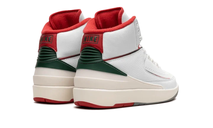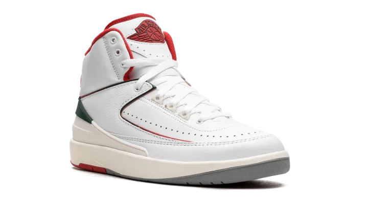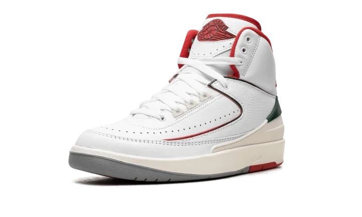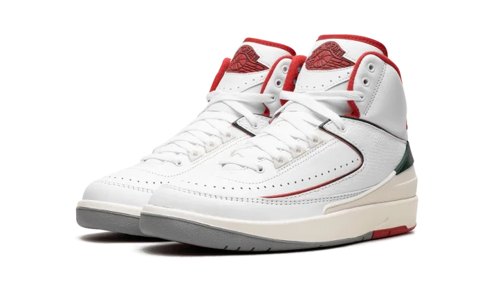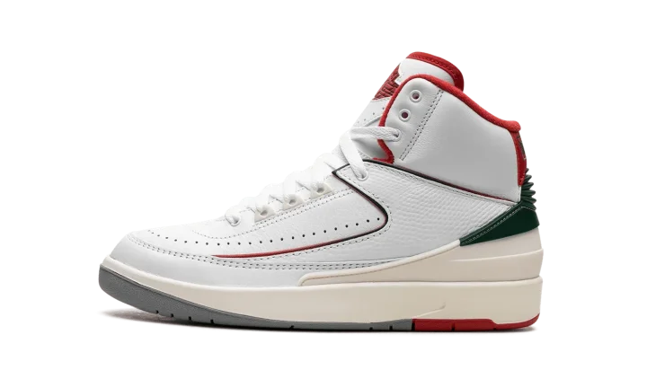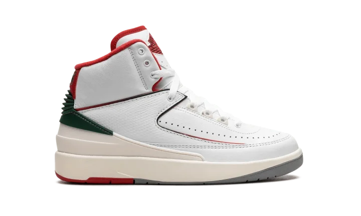 The Air Jordan 2 GS "Italy" is the youth sizing of Michael Jordan's second signature shoe inspired by its Italian-made roots. The original Air Jordan 2 from 1987 was manufactured in Italy and is considered to be the first "Luxury" basketball sneaker. The "Italy" AKA "Origins" Air Jordan 2 is similar to the design of the model's original "White/Red" colorway, but with added green detailing to represent the colors of the Italian flag. Specifically, the upper is designed with a white leather construction with tonal textured leather overlays. Contrasting Fire Red detailing lines the overlays, heel counter, and interior lining. The piping that runs across the upper transitions from red to green, and the heel piece and "Nike" branding on the heel also appear in green. Release date: November 18, 2023