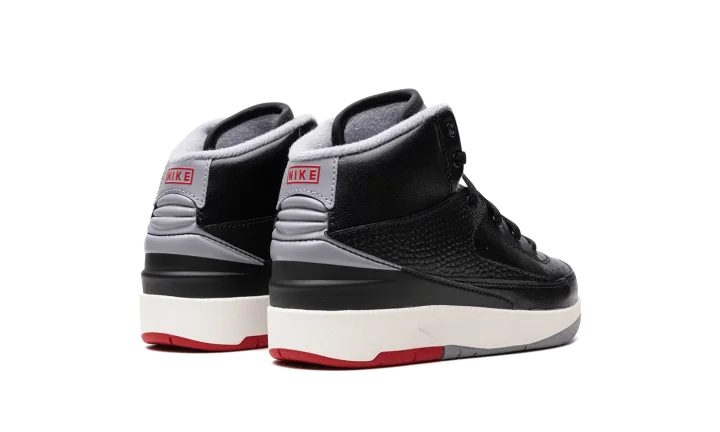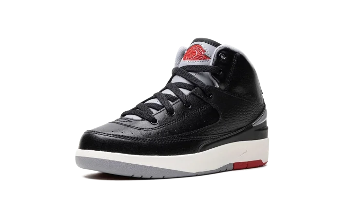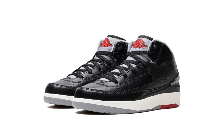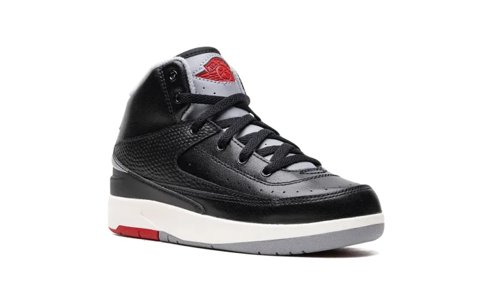 The Air Jordan 2 Retro PS "Black Cement" is the preschool sizing of Michael Jordan's second signature shoe in a colorway inspired by a classic Air Jordan design. The shoe in question is the Air Jordan 3 "Black Cement," one of the most iconic sneakers of all time. Here, the "Black Cement" Jordan 2 mimics the Jordan 3 of the same nickname's look with black, grey, and red detailing. More specifically, the shoe has a black leather construction with contrasting Cement Grey accents on the heel, tongue, and inner lining. A red "Wings" logo appears on the tongue. Underfoot, the white midsole is paired with a red and grey rubber outsole. Release date: September 23, 2023