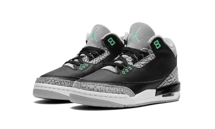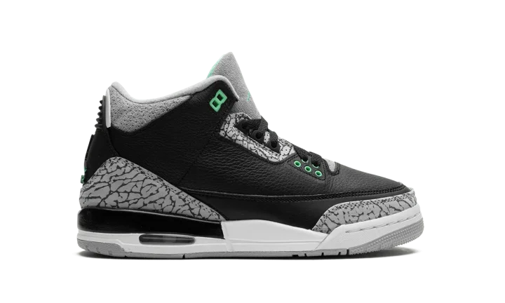 The Air Jordan 3 GS "Green Glow" is the youth sizing of the retro basketball shoe loosely inspired by the model's original "Black Cement" style, but with a few changes. Like the Jordan 3 "Black Cement," the "Green Glow" features a black leather upper and grey elephant print details, but with light green accenting instead of the red accenting found on the "Black Cement." Specifically, Green Glow accenting appears on the eyelets, on the Jumpman branding on the tongue and heel, and on the "Jordan" logo on the outsole. A black painted mudguard appears on the heel above the white midsole. A small visible Air unit in the heel of the midsole gives the "Green Glow" a classic Jordan 3 look.