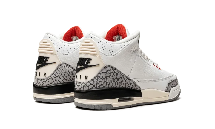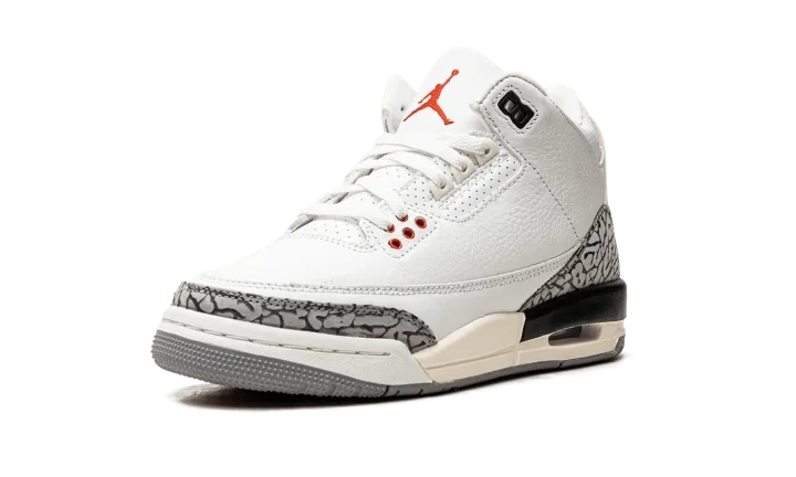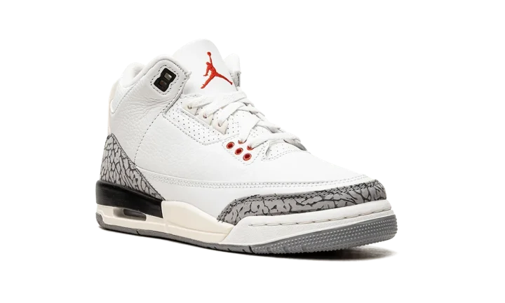 The Air Jordan 3 GS "White Cement Reimagined" is the youth sizing of the special version of the vintage basketball sneaker that replicates its original design. Released in 2023 to celebrate the iconic Jordan 3's 35th anniversary, the "White Cement Reimagined" retains the look of the model's "White Cement" colorway with accurate-to-original panels, colors, and overall shape. Faithful to the 1988 version of the Jordan 3 "White Cement," the "Reimagined" features a higher-cut ankle collar inspired by the OG Jordan 3's design. It also is equipped with a white leather upper with contrasting grey elephant print on the toe and heel, which has also been modified to look like the detailing on the original Jordan 3. The "Nike Air" branded heel counter has an aged, vintage look, as does the midsole. Release date: March 11, 2023