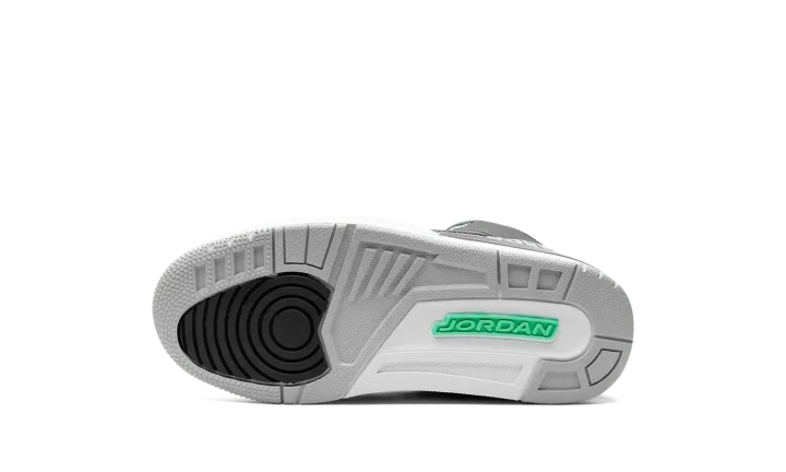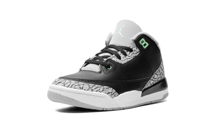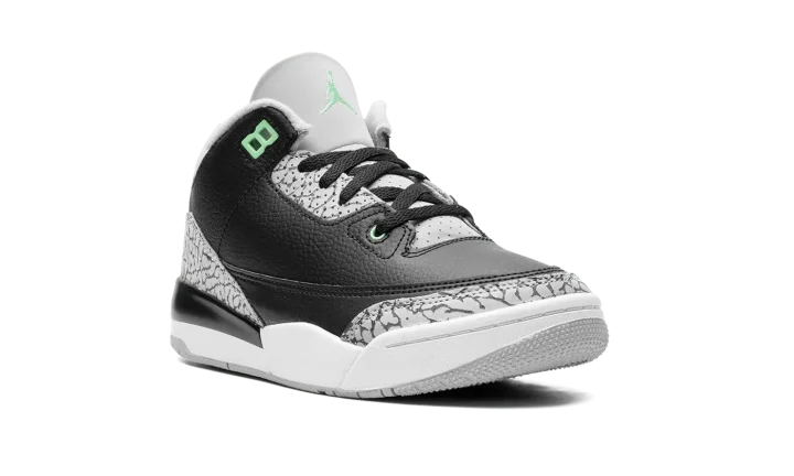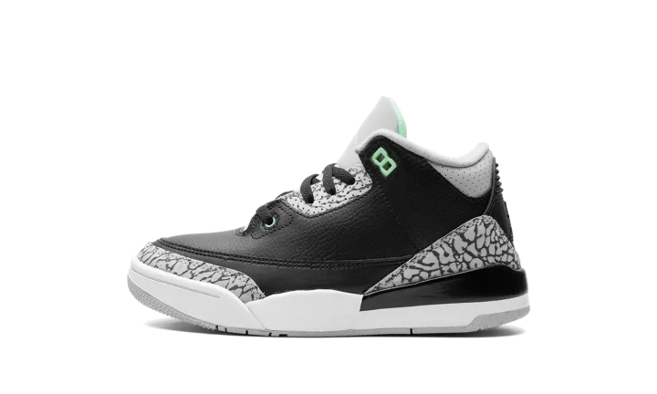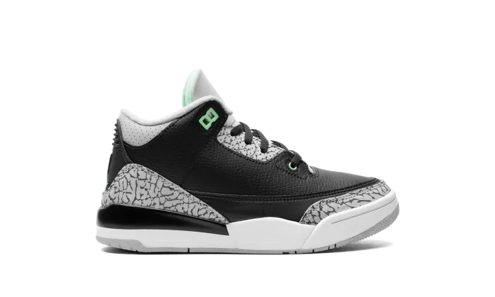 The Air Jordan 3 PS "Green Glow" is the preschool sizing of Michael Jordan's third signature shoe in a colorway loosely inspired by the model's original "Black Cement" style, but with a few changes. Like the Jordan 3 "Black Cement," the "Green Glow" features a black leather upper and grey elephant print details, but with light green accenting instead of the red accenting found on the "Black Cement." Specifically, Green Glow accenting appears on the eyelets, on the Jumpman branding on the tongue and heel, and on the "Jordan" logo on the outsole. A black painted mudguard appears on the heel above the white midsole. A small visible Air unit in the heel of the midsole gives the "Green Glow" a classic Jordan 3 look.