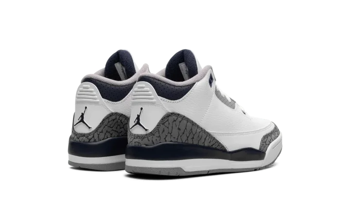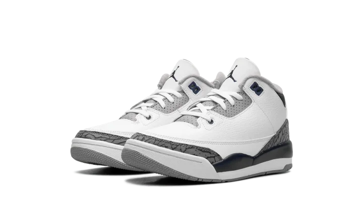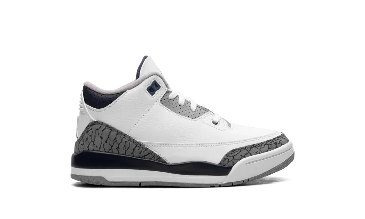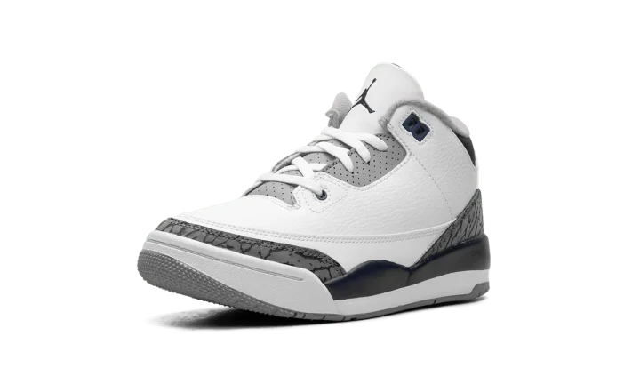 The Air Jordan 3 PS "Midnight Navy" is the preschool sizing of Michael Jordan's third signature shoe with navy accents. The "Midnight Navy" colorway features a white leather upper with elephant print overlays on the toe and heel. A Midnight Navy-colored mudguard contrasts the look, as do the Midnight Navy eyelet holes. More Midnight Navy accenting is featured on the Jumpman on the white leather tongue and on the Jumpman on the heel. The white midsole has a clear Air bubble in the heel. A grey rubber outsole completes the look. Release date: January 13, 2024