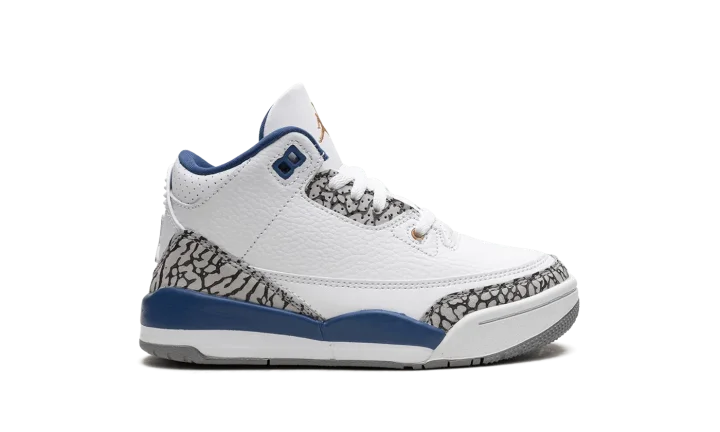 The Air Jordan 3 PS "Wizards" is the preschool sizing of the modern, retail version of the former player exclusive colorway for Michael Jordan. Originally an unreleased sneaker worn by Jordan during his tenure with the Washington Wizards in the early 2000s, the Jordan 3 "Wizards" was officially released by Jordan Brand in 2023. The colorway's white, blue, and elephant print accents nod to the Air Jordan 3 "True Blue's" color scheme, and its gold accents salute the Wizards' former team uniform colors. The shoe features a white leather construction with classic elephant print on the toe and heel. True Blue detailing comes into play on the eyelet panel and on the mudguard. A gold Jumpman is embroidered on the tongue. Release date: April 29, 2023