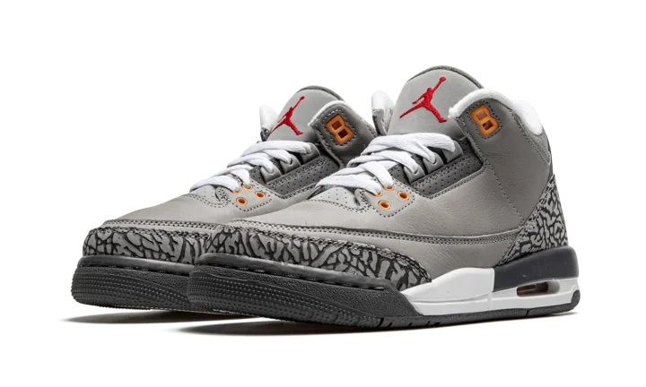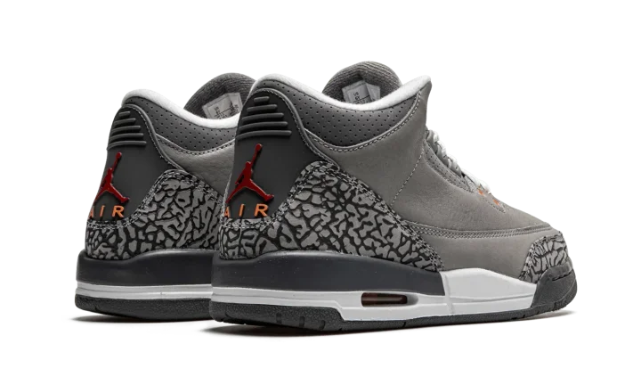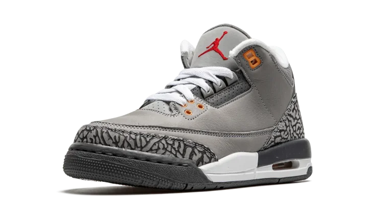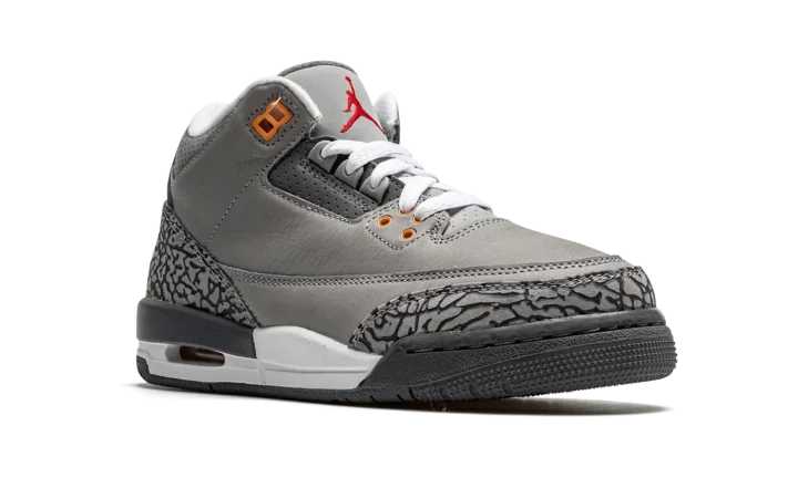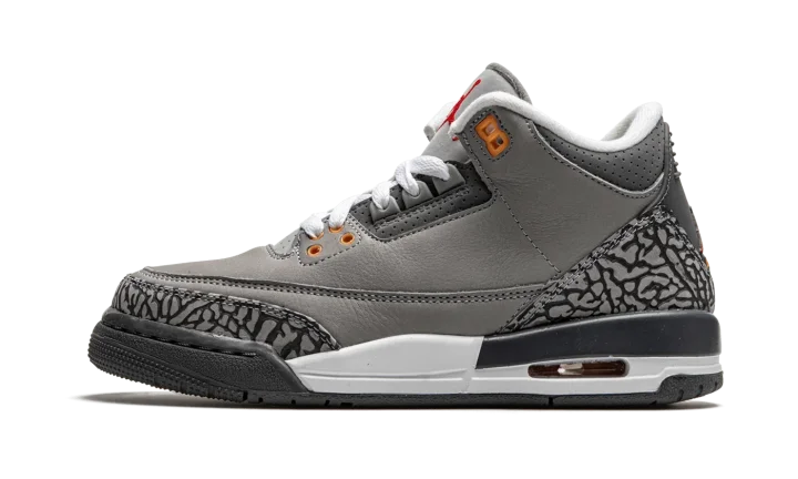Embrace a timeless favorite with the Air Jordan 3 Retro GS "Cool Grey." This Grade School-sized sneaker is a highly anticipated reissue of the popular 2007 colorway. It features a sleek Cool Grey leather upper accented by the signature elephant print overlays in a matching tonal shade. Subtle but vibrant pops of Orange Peel and Sport Red on the molded eyelets and Jumpman branding break up the neutrals. With visible Air cushioning, this shoe delivers both legendary style and supreme comfort.